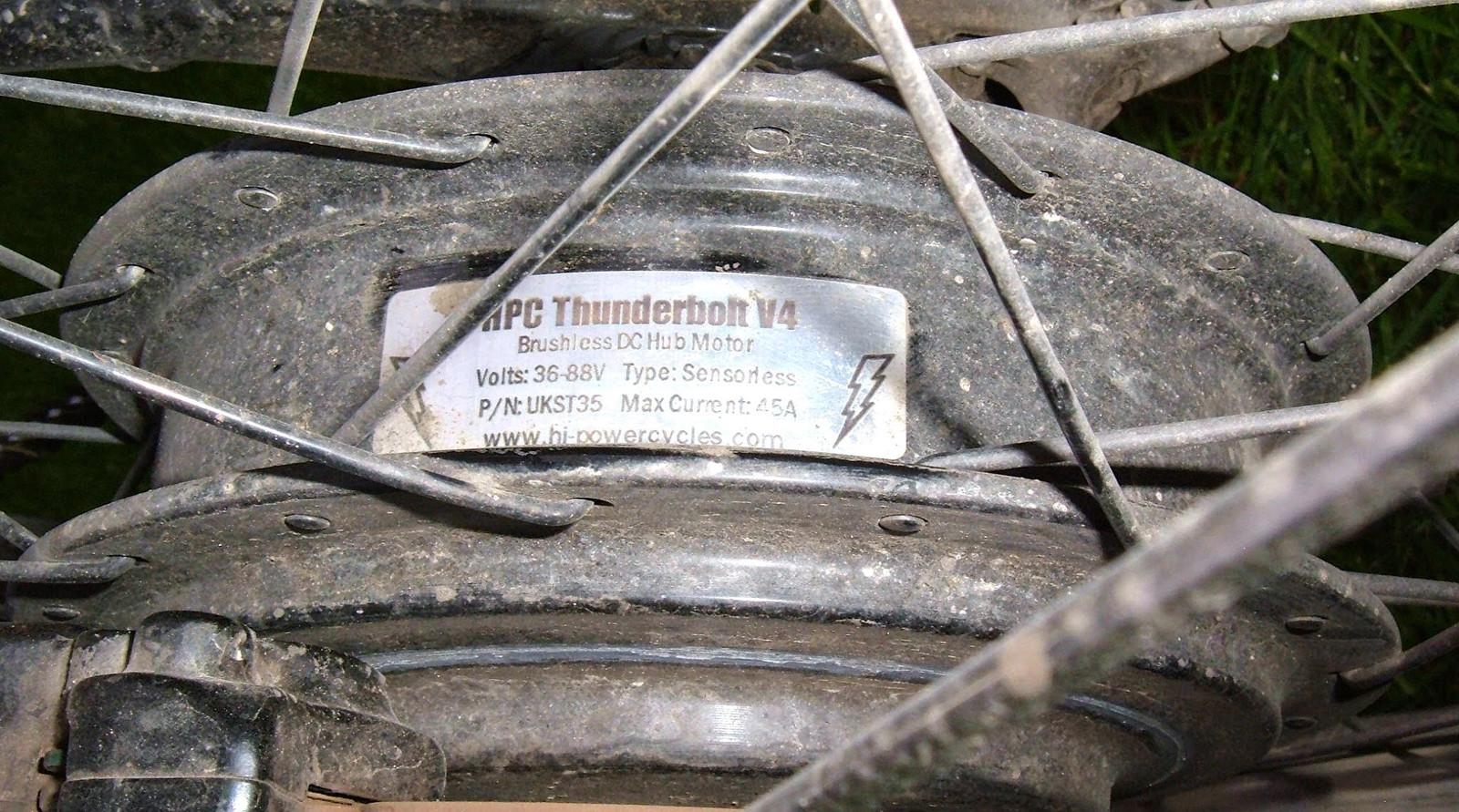 - A “HPC Thunderbolt” V4 motor (really, a BMC V4C) - geared, rear hub, capable of way more power than I was going to put into it (rated up to 88v/45A - I’m putting 38v/35A through it).