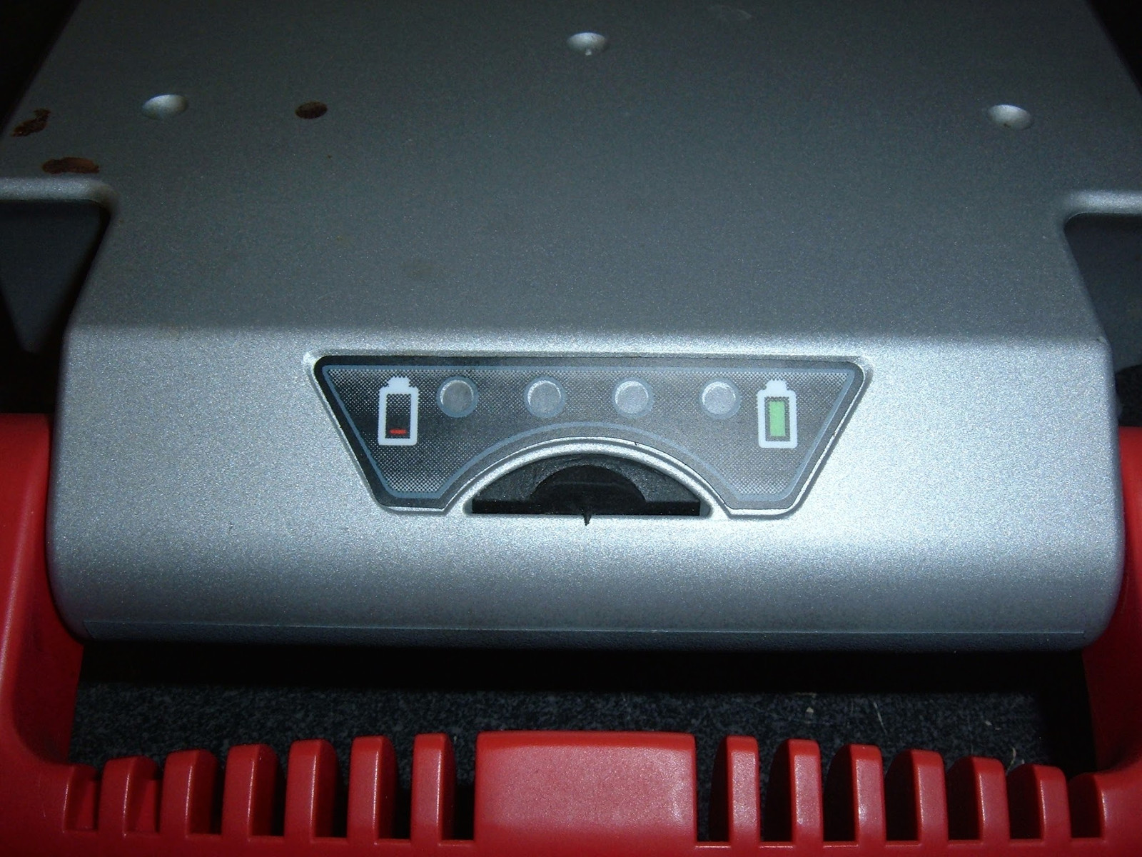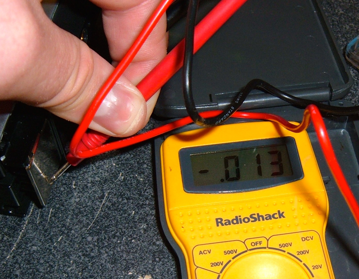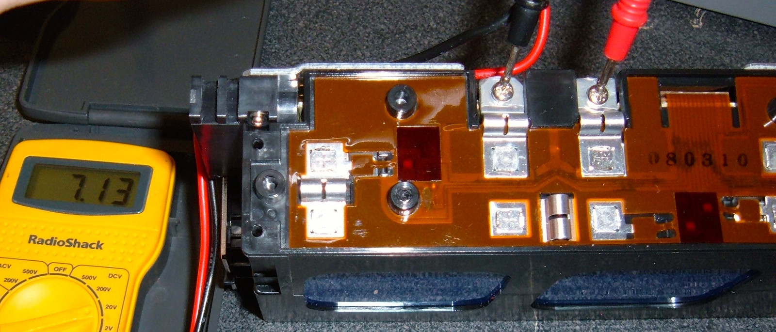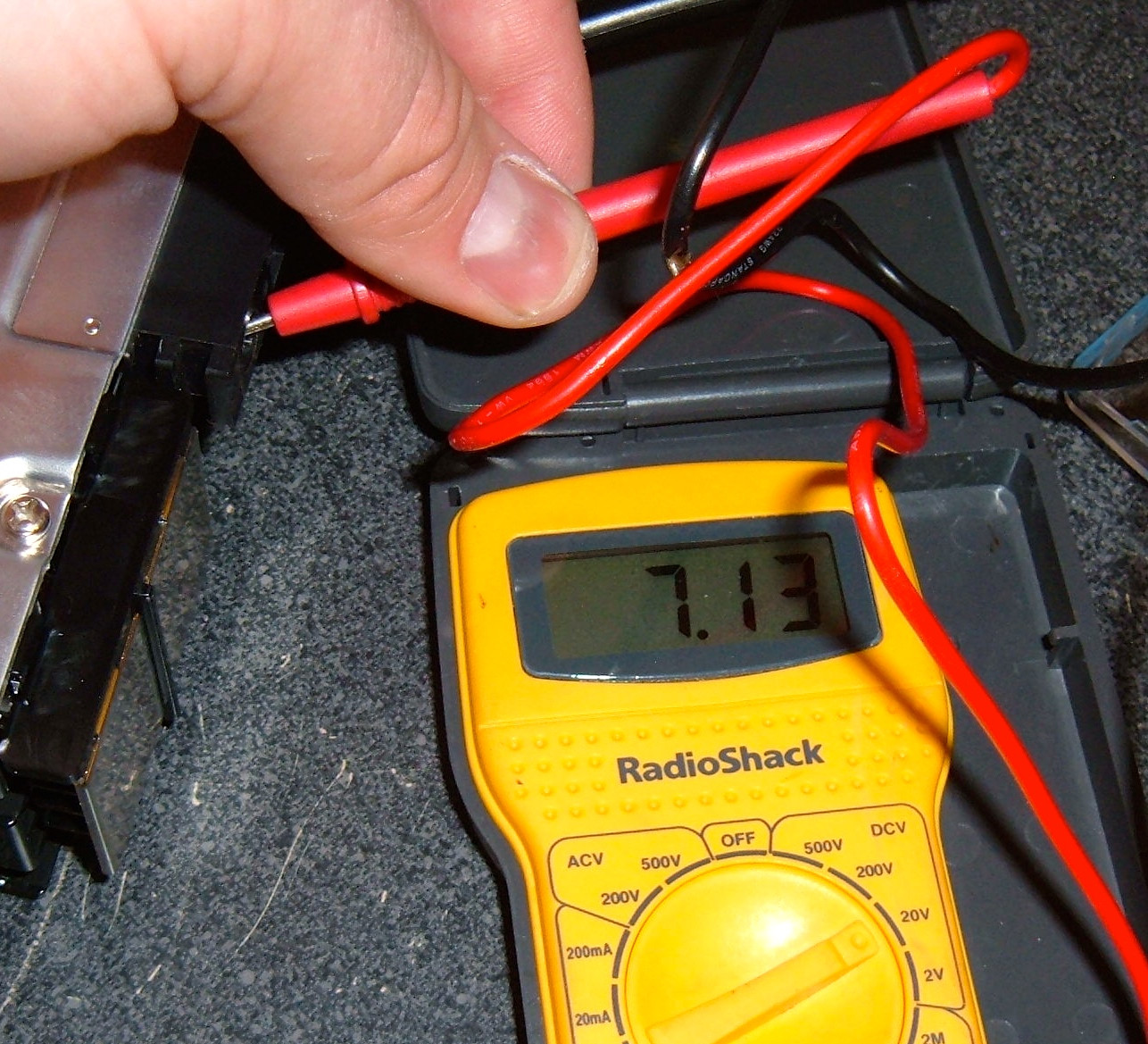 My handy Radio Shack voltmeter (yes, it’s cheap, but it’s accurate and was upstairs) is useful to find out what the pack voltage is. I previously mentioned that the big charging sockets were apparently connected to the pack. They’re showing 7.13 volts. On a 24v pack with a ~2.3-2.5v chemistry… this isn’t good. That’s very definitely a drained pack.