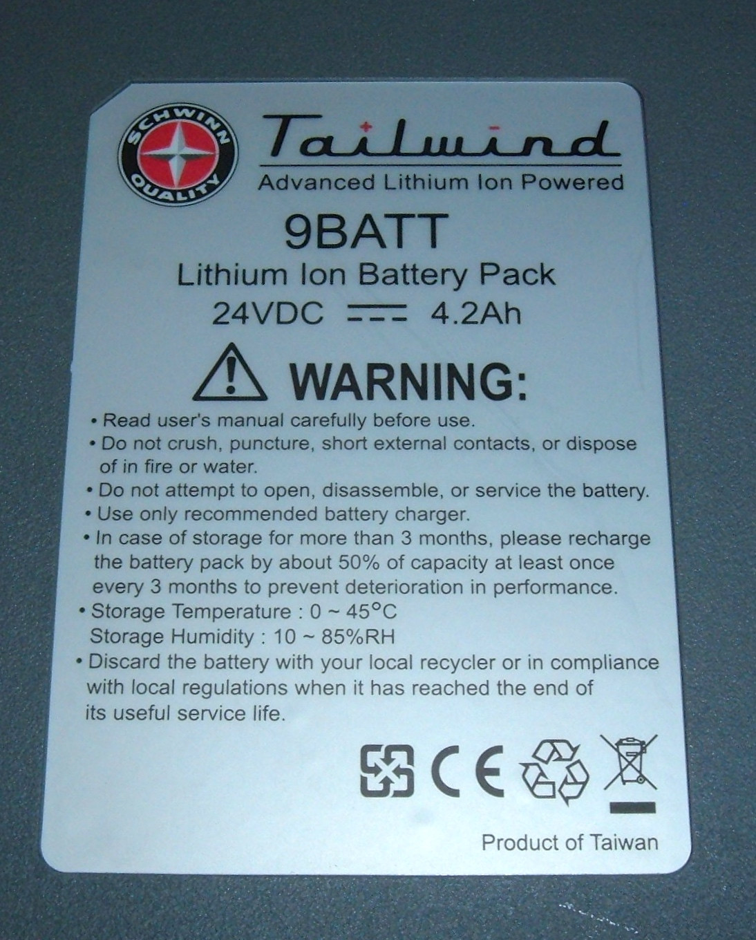 The label informs us that we’re looking at a Schwinn Tailwind - it’s Advanced Lithium Ion Powered. No, it’s not powered by anything right now, but I suppose it was when it came from the factory. And, as always, I’m going to “attempt to open, disassemble, or service the battery.” All three, actually.