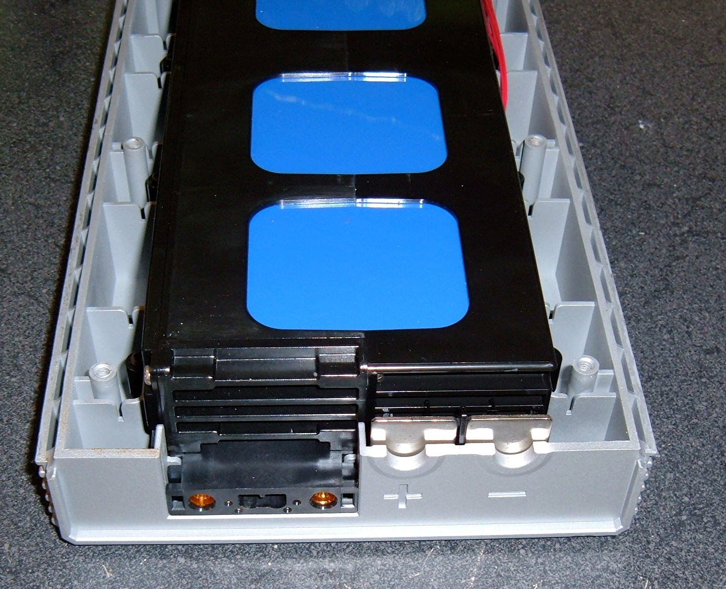 The other side of the pack is the same thing that was visible with the outer case separated. There’s a black plastic outer shell, and then the blue plastic that feels like some sort of cell casing. So far, I see no evidence of any cylindrical cells in here. If they’re in there, I can’t feel them.