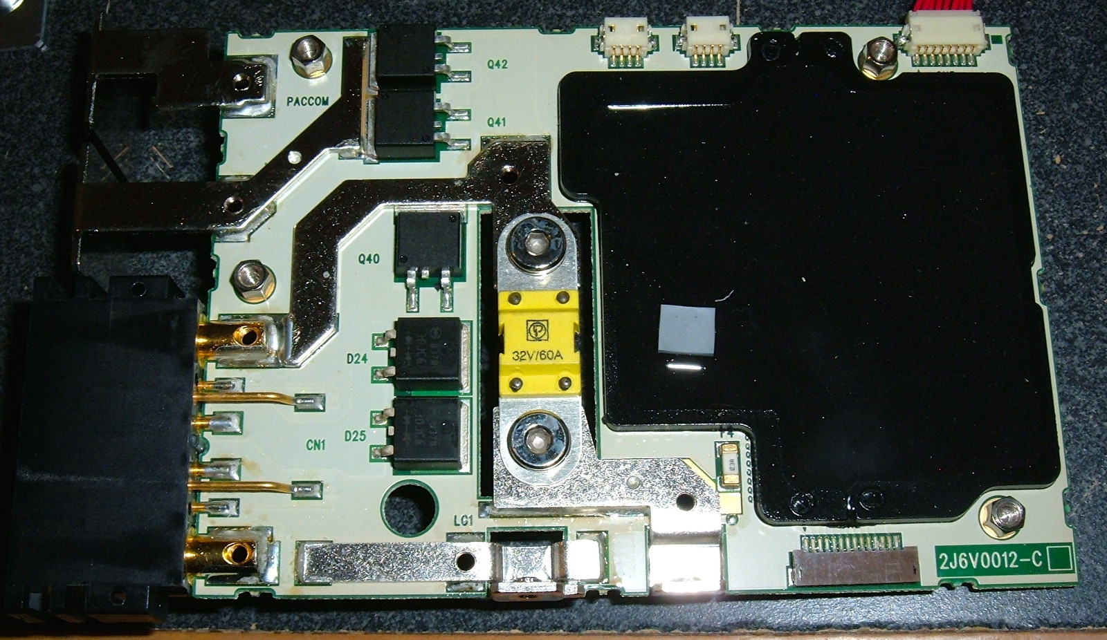Two more screws (up to 31) for the main terminals, slide a ribbon cable out, and the BMS comes out. And… wow. This is a serious BMS, but annoyingly, the good stuff is potted over. The center fuse is a 32V/60A fuse, and I don’t doubt for a second that this BMS can take the current.