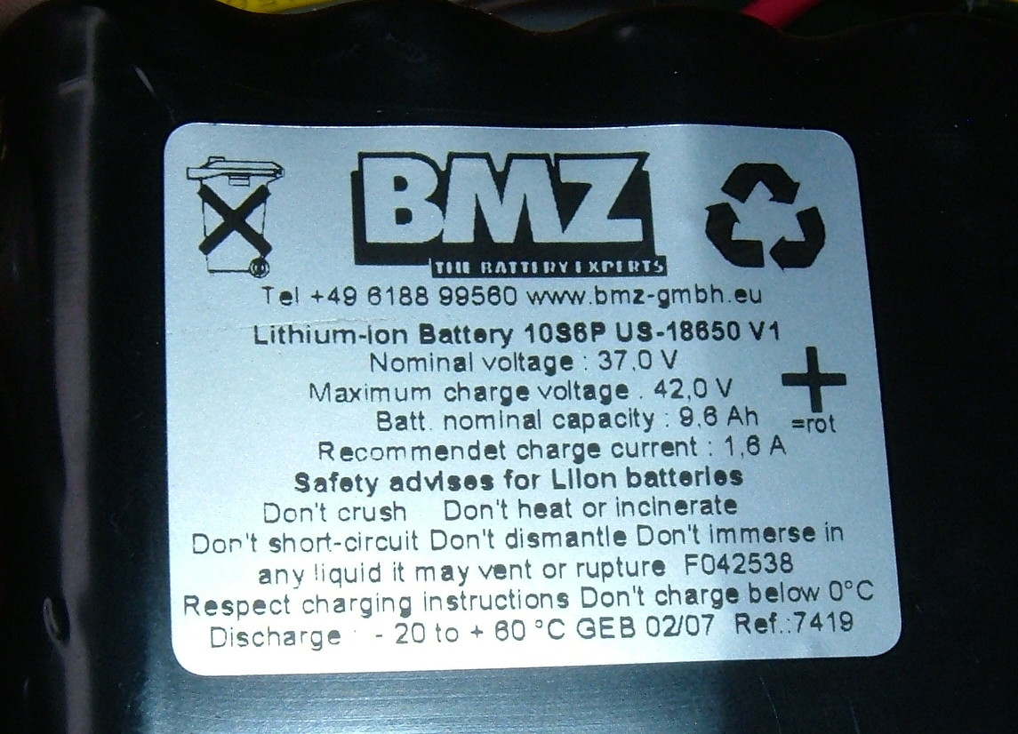 This is the label for the actual battery pack. 37v nominal, 42v charged - this is probably a 10S battery pack! 9.6AH, as expected, and a max charge current recommendation of 1.6A, or 0.16C. Slow. Interesting.