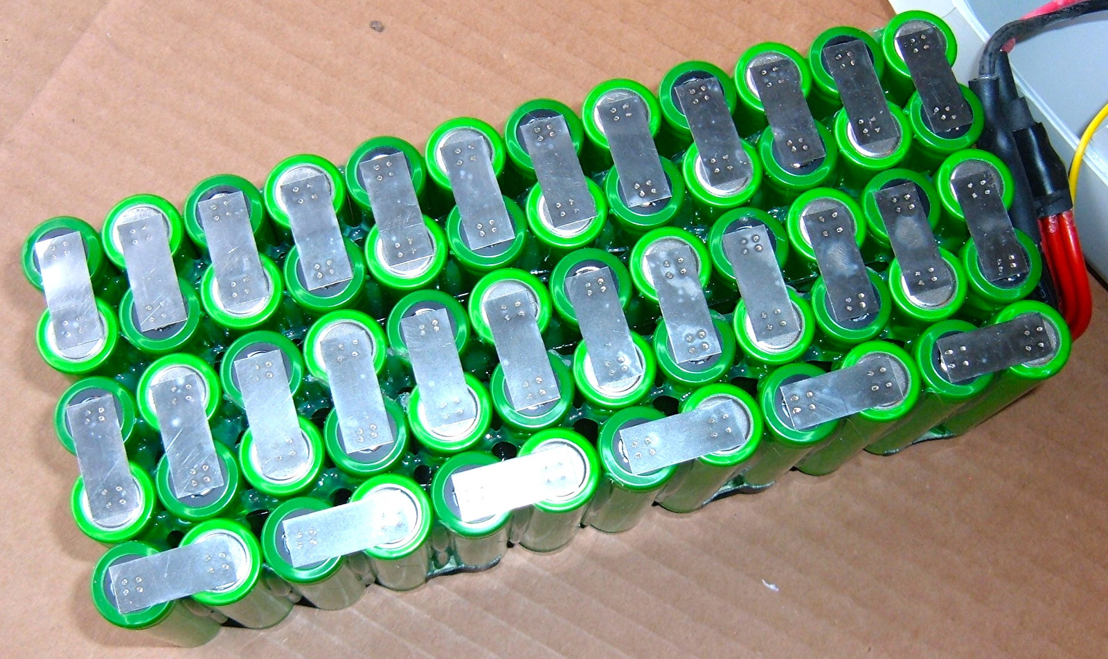 With the shrink wrap fully removed, it’s clear what’s going on. This pack is a 10S6P pack - but the cells are wired series first, then in parallel. The underside of the pack makes it clear. The inter-row connect at the bottom pairs two rows of 5 into a 10S unit, and there are 6 of them in parallel. Each two rows makes an independent 37v/1.6AH unit.