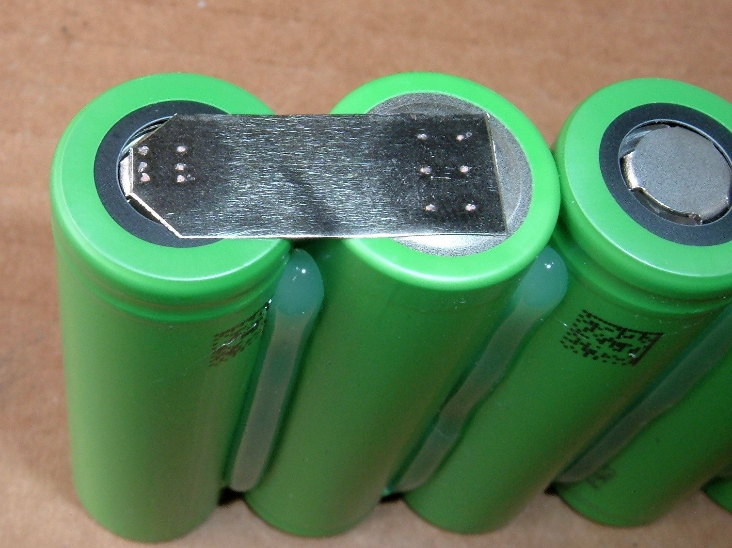 After spot welding the revised strip on one of the strips of batteries, it looks like this. The risk of punching through the plastic insulation on the positive terminal is significantly reduced with this design. The negative terminal doesn’t matter, as the only thing the sharp corners can punch through to is the negative terminal (where it’s already connected). The excess metal I’ve hacked off isn’t contributing to current carrying, just to being a potential short. So I’m happy with this tweak.