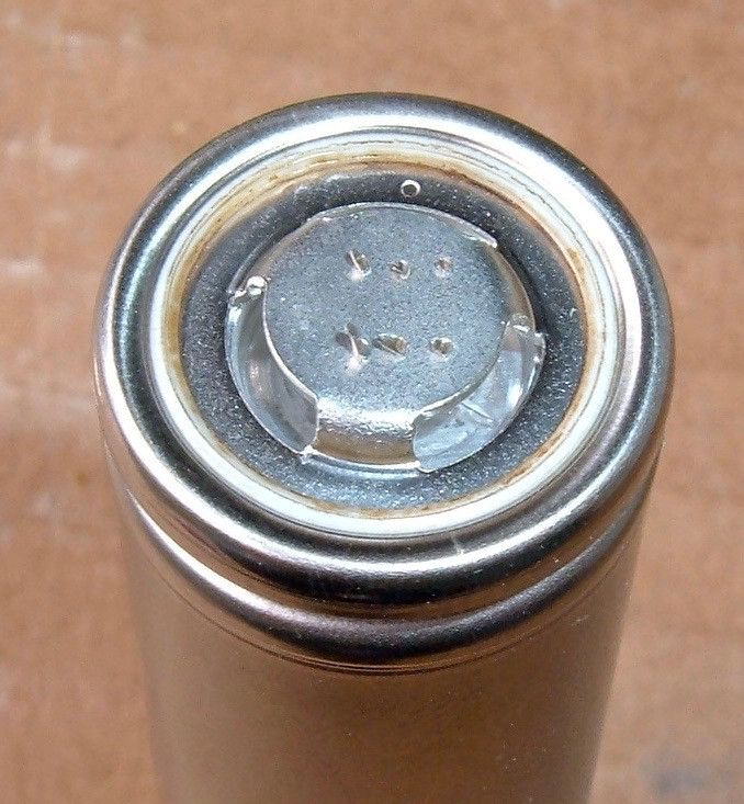 In this naked (scrap) 18650, you can see what I’m talking about. The raised center cap is the positive terminal, and then there is insulation between that and the outside ring, which continues down the side and makes up the negative terminal. The plastic ring and plastic insulation provide some protection, but it’s not hard to punch through it and short things out. The discoloration on this particular cell may be a result of some experimentation along this lines…