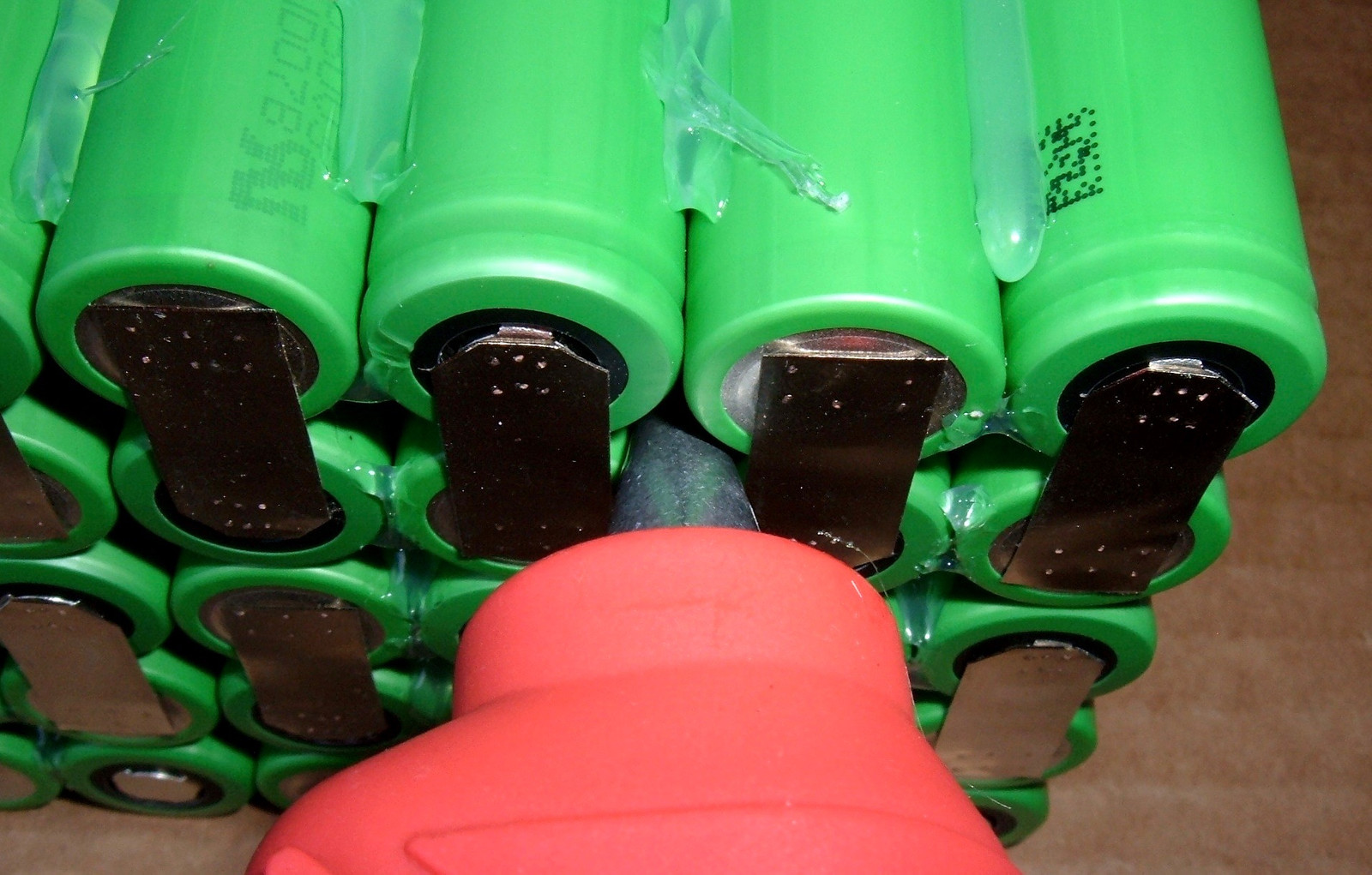 You’ll notice that I haven’t welded any of the 1x5 modules together yet. There’s a good reason why, and it’s the hot glue gun. To put the pack together, I have to run the hot glue nozzle into the gaps between the cells - I’m not just gluing at the edges, but for all the interior junctions as well. Were the pack welded up fully, the following would be disturbingly close to a short (this wouldn’t actually be, because it’s between 2x5 modules, which wouldn’t be wired together, but if I miscount or need to touch up a 2x5 module glue job, I’d run a good risk of shorting the pack).