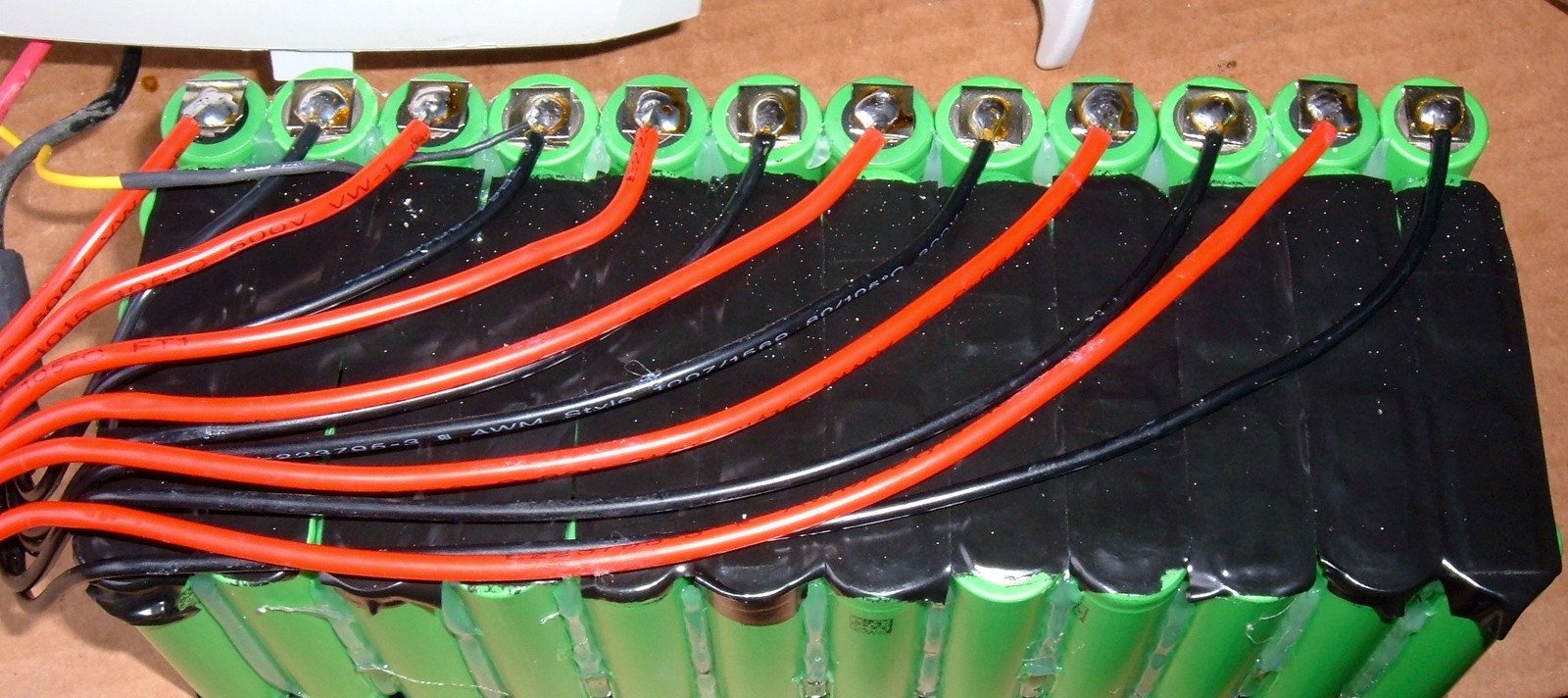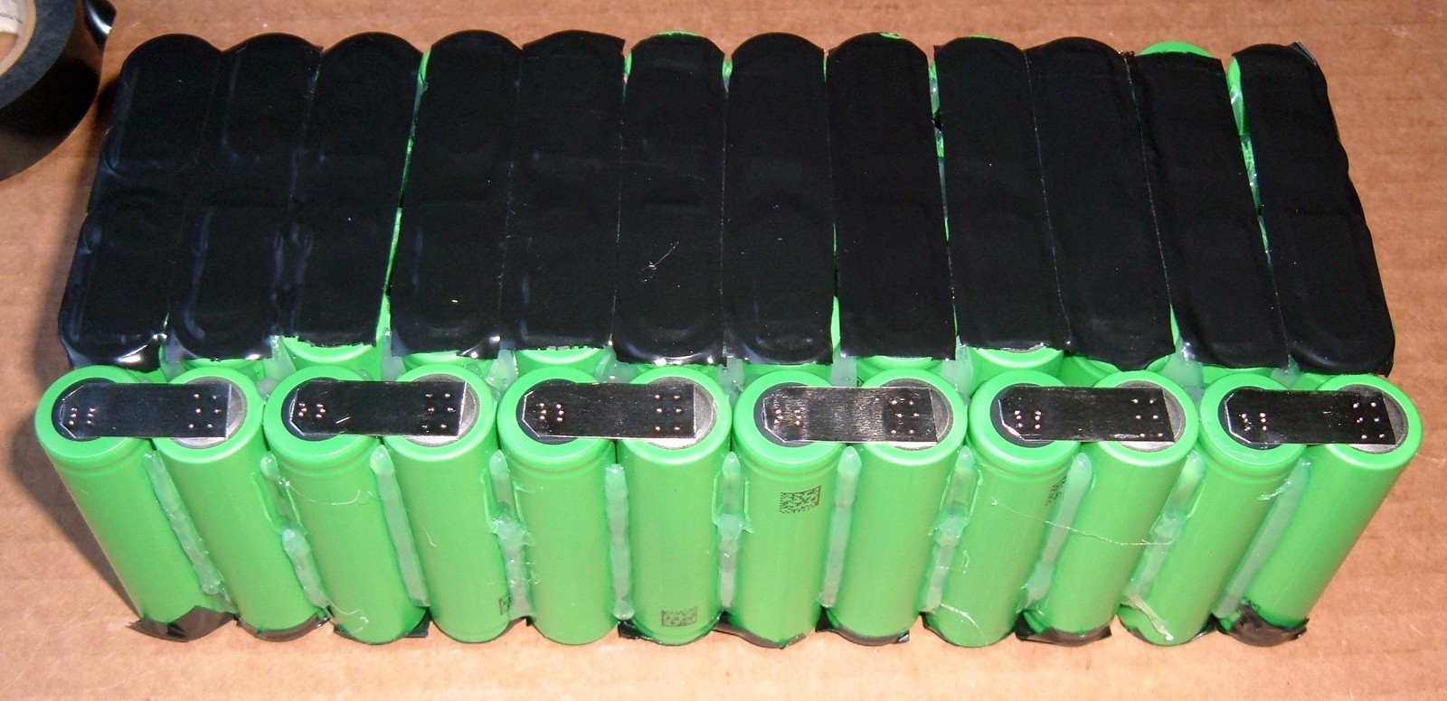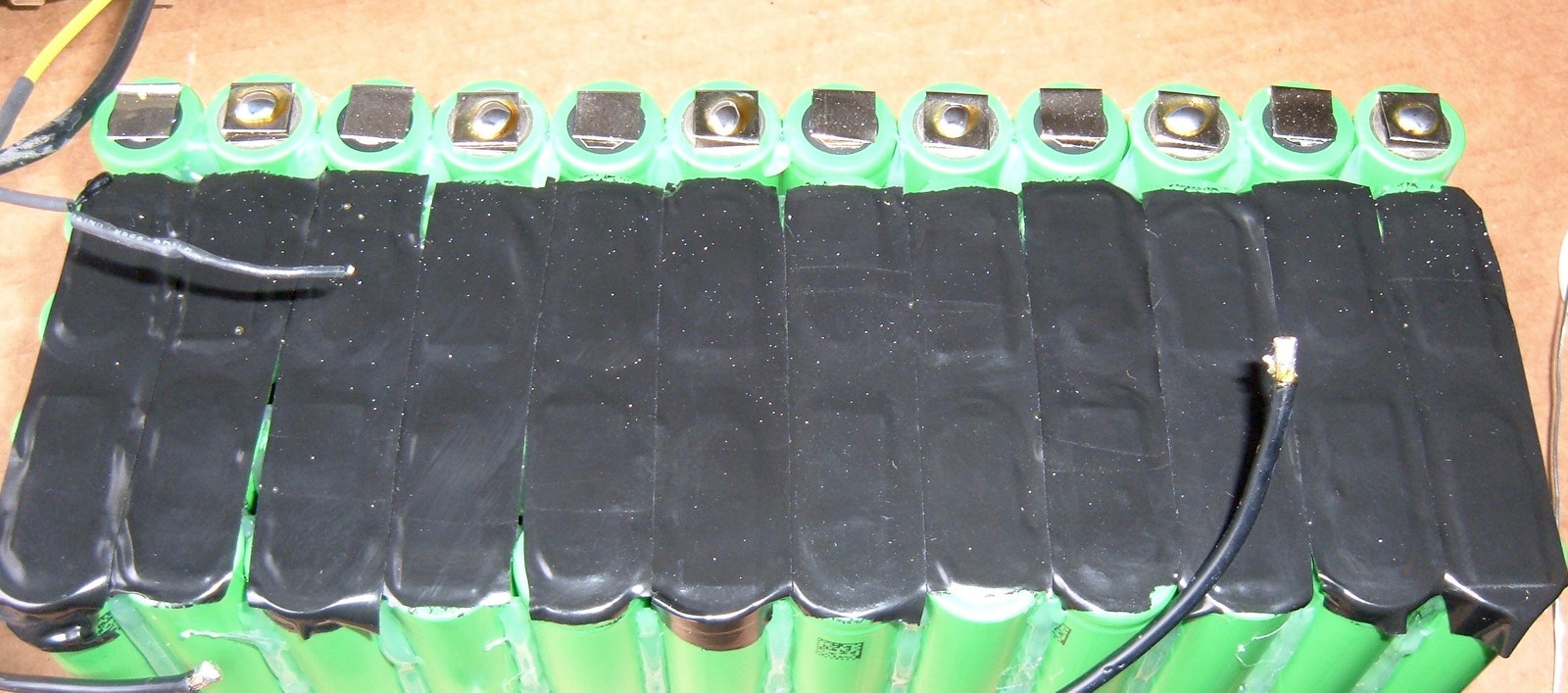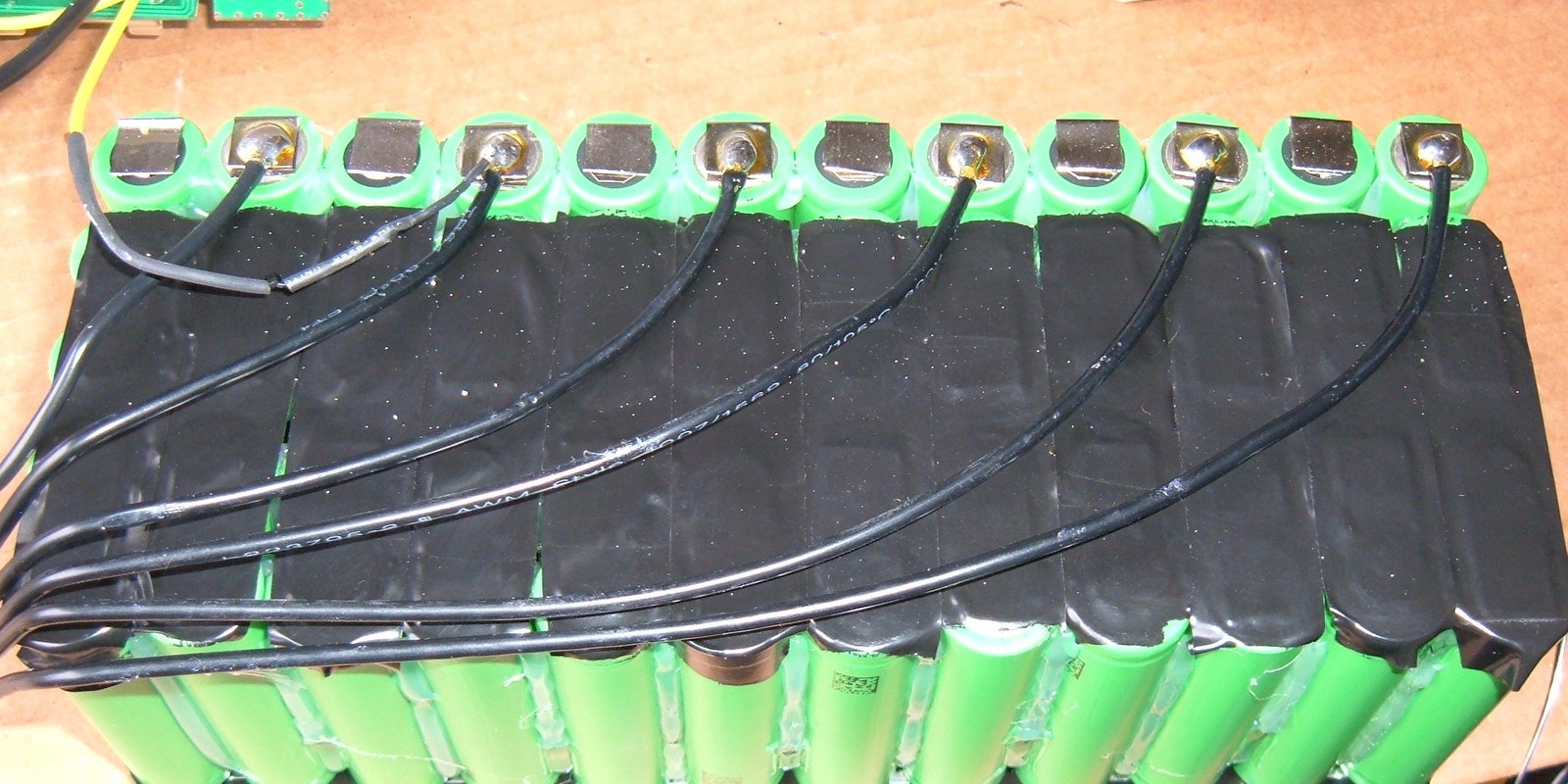 There are two steps left in the spot welding. The first is to join the 2x5 packs into 10S packs. This is done opposite the power connection wiring, and looks a lot like this. After welding, it’s taped off.