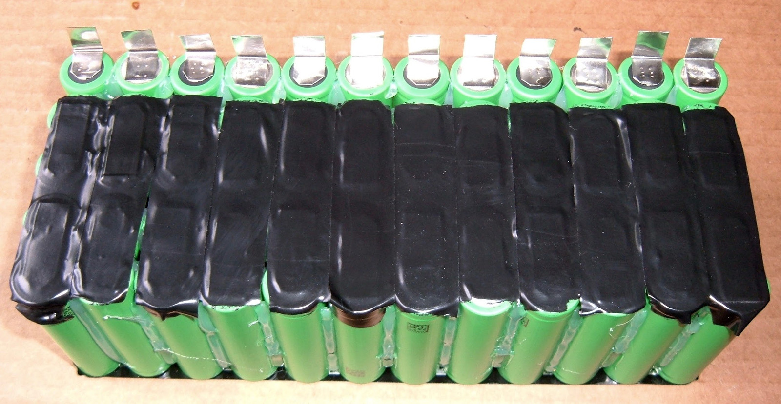 A bit of hot glue along the edges, and a lot more hot glue down the center gaps, and there’s a 10 cell pack! It’s still 2 5S packs glued together right now, as it’s not welded into a 10S pack yet, but there’s a good reason for this isolation that will be made clear later.