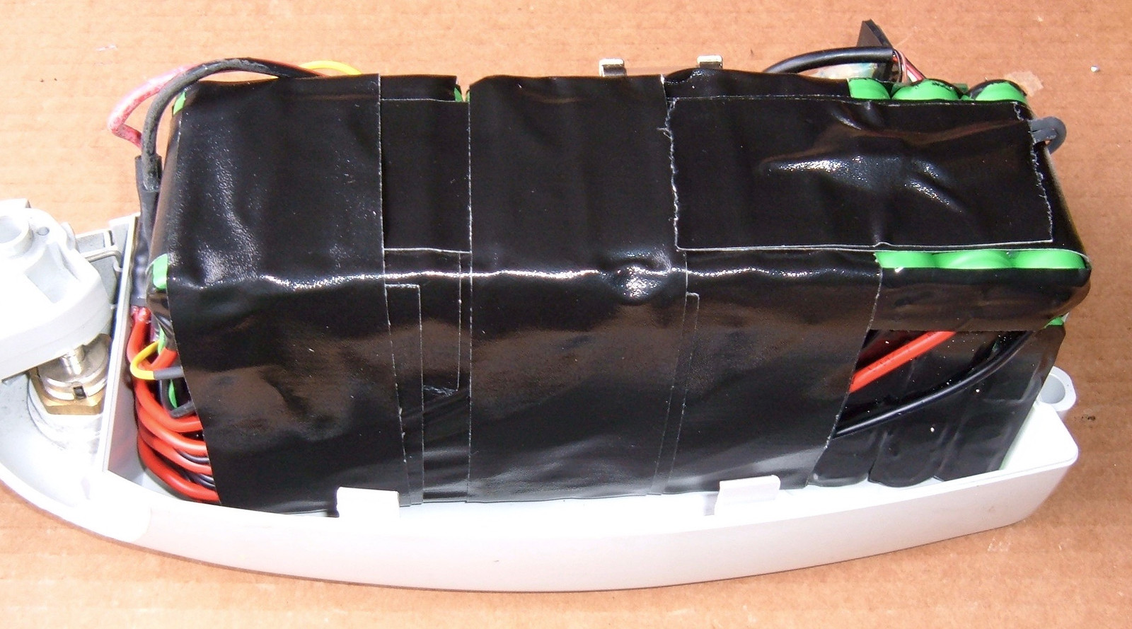 A bit of structural tape helps keep the wires in place, and it’s time to assemble the pack. These pictures have the battery unit rotated 90 degrees from the final orientation, since it was easier to take photos this way.