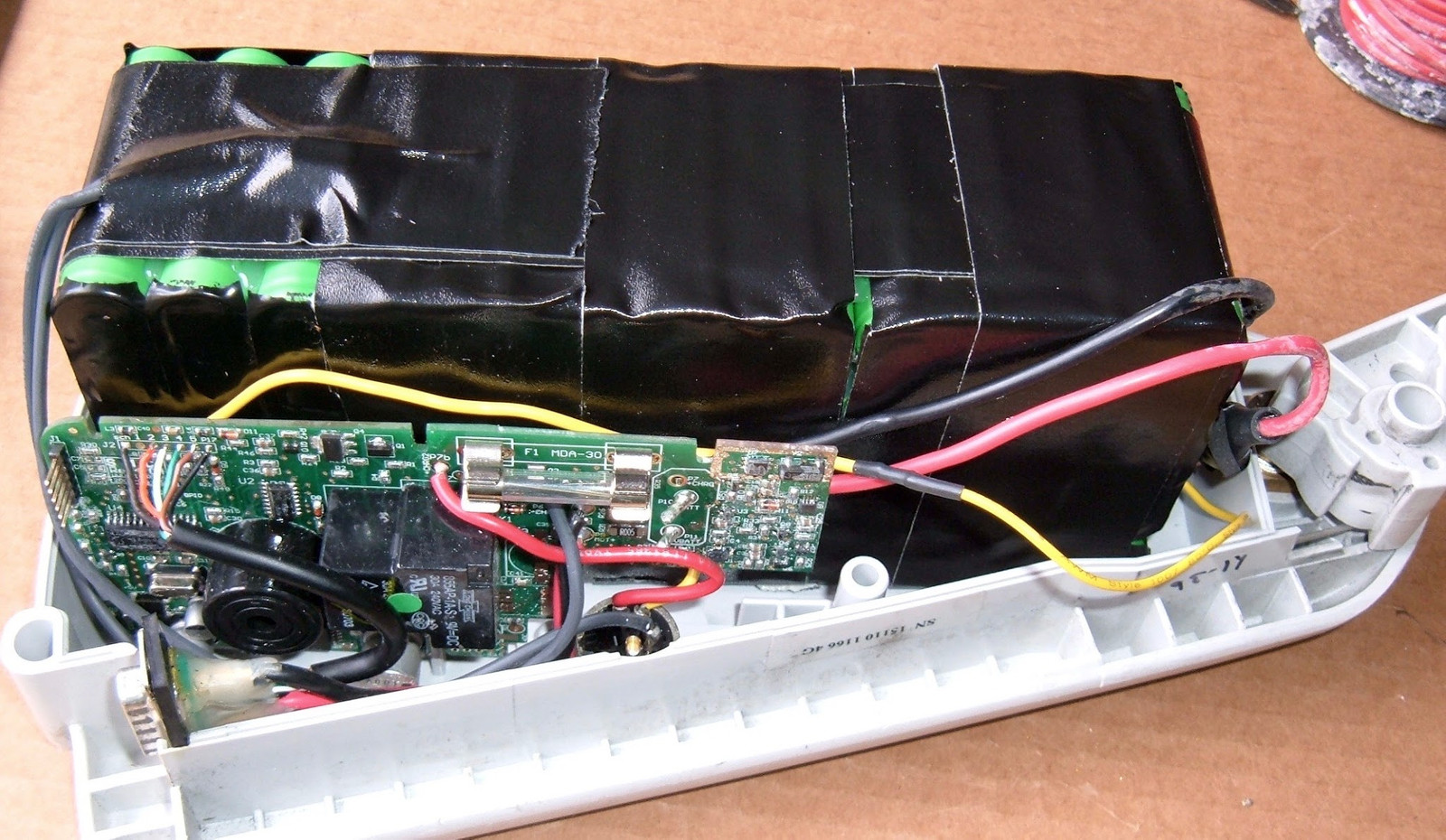 The next step is to insulate it. I’m using electrical tape here. This is because, as noted above, I really don’t like shorting packs out. Especially with the spider web of power wires coming off the pack, there’s a big risk of doing this if I don’t insulate everything carefully.