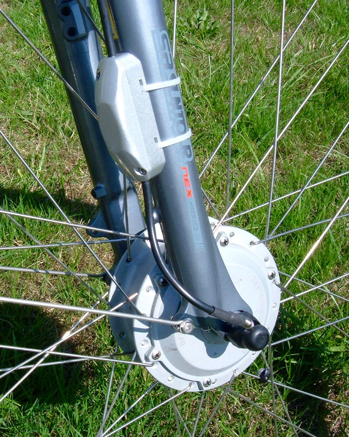 This bike is powered by a small front hub motor. It’s a brushless geared motor (excellent!), and supposedly rated for 180W sustained/250W peak output, though I haven’t stuck an ammeter on it to verify the power consumption (and, sadly, I lack an ebike dyno). It claims 220W on the actual motor. So, it’s something in that range. The controller for it is zip tied on a fork tube. Count the zip ties, for fun. This bike is crawling with them.