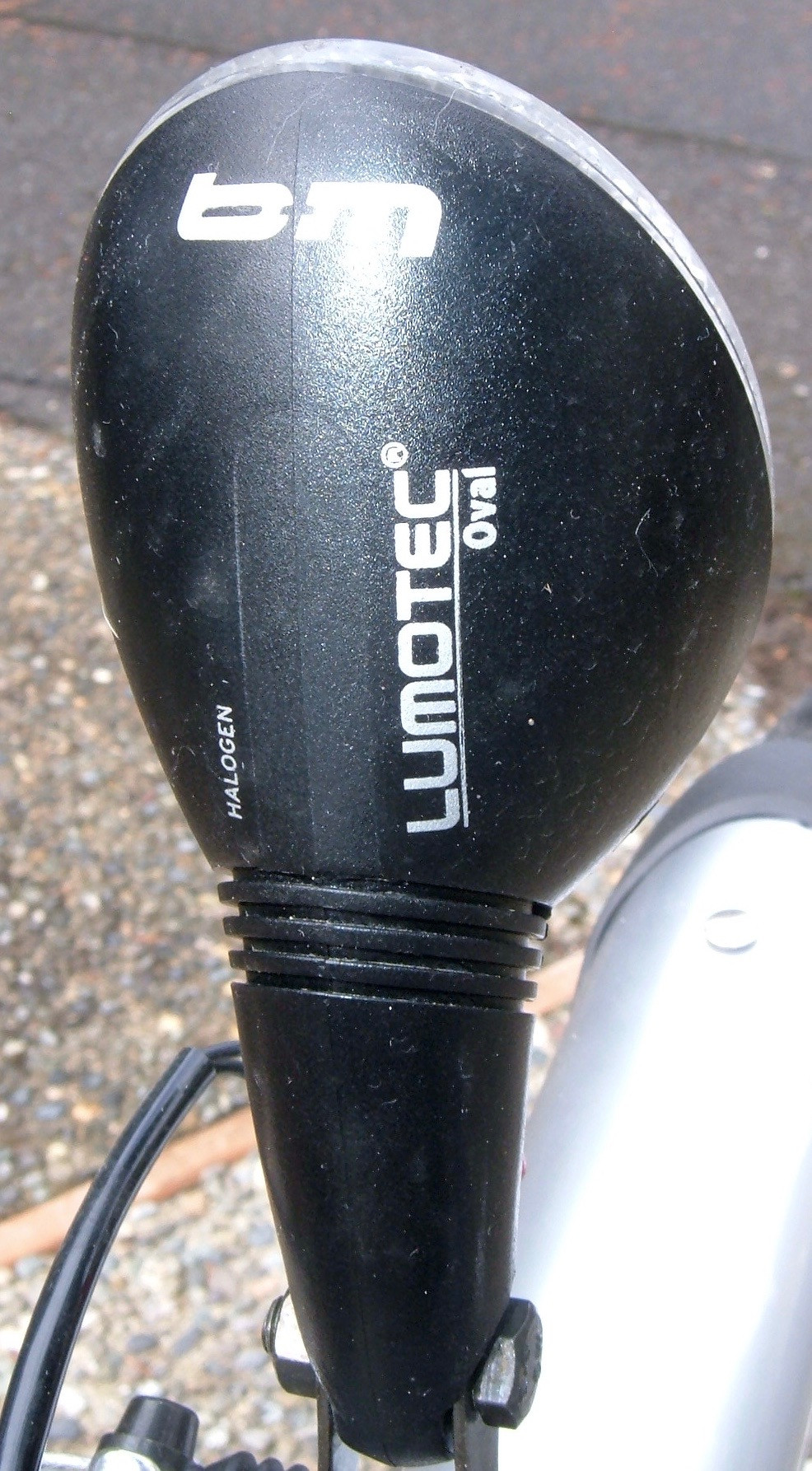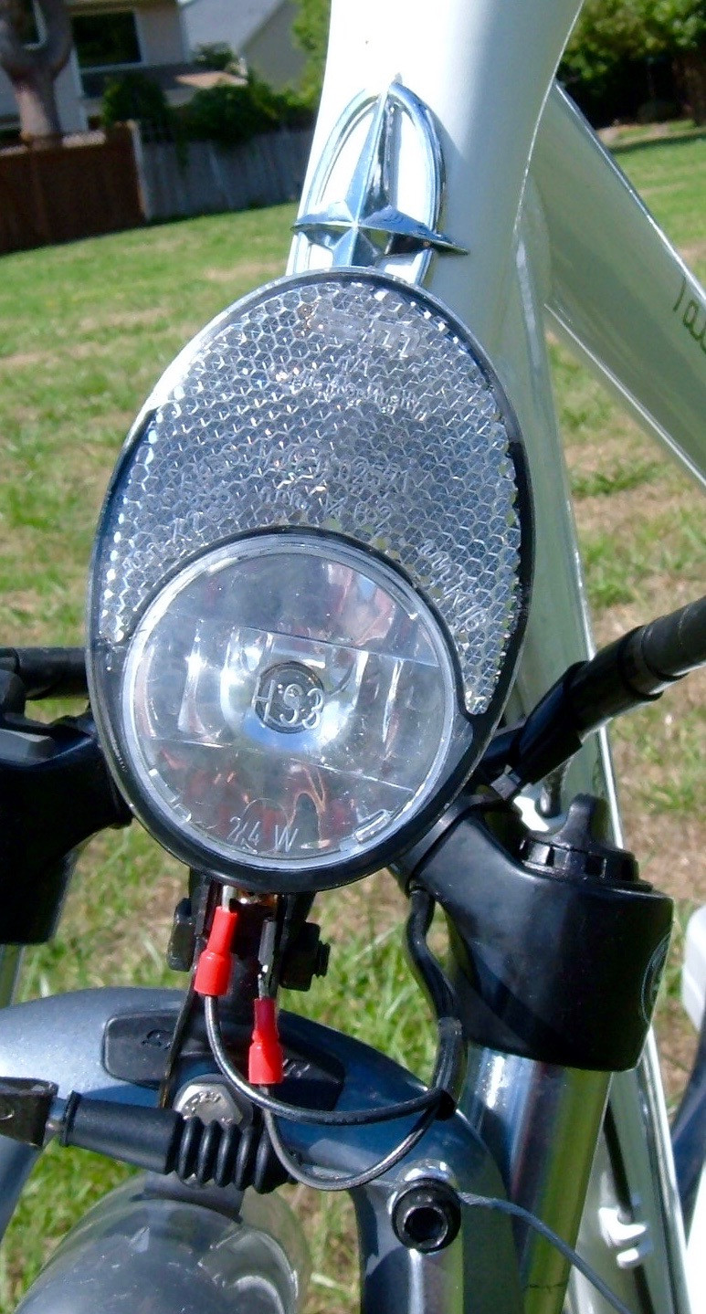 This is the front light (a Lumotec Oval Halogen) and reflector. It’s powered by a generator from the rear wheel. The light… lights up. It’s incandescent. It doesn’t get very bright. I’m not really sure what it’s point is since it’s not very useful at night, but it does have a front light.