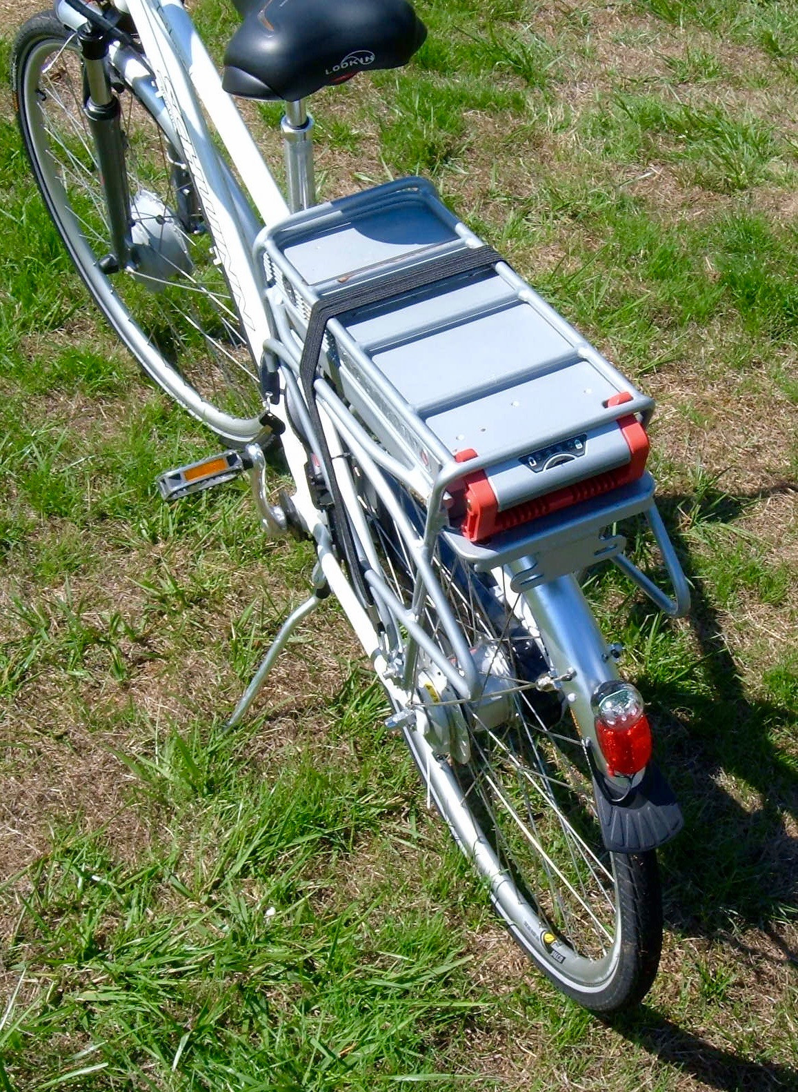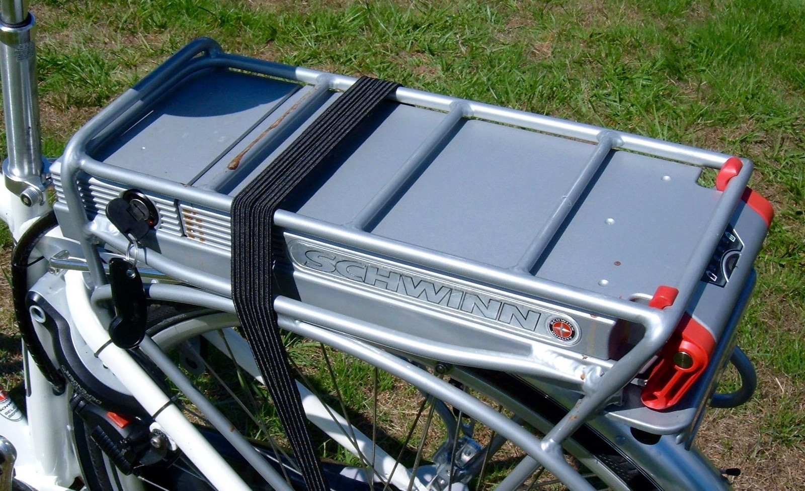 The rear rack holds the battery pack, the contacts for the battery pack, and comes with a nice elastic strap for holding things down. I really like the elastic strap!