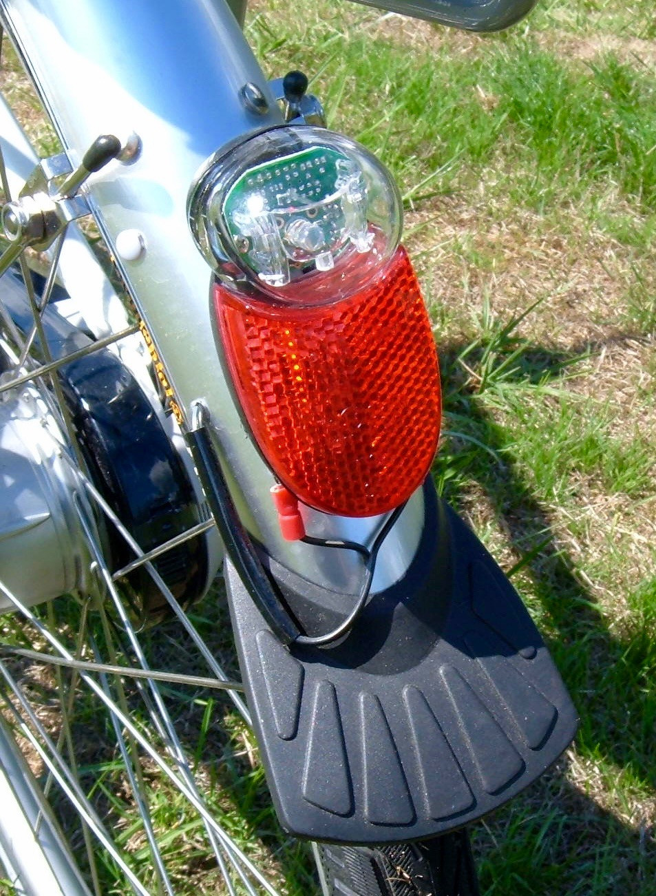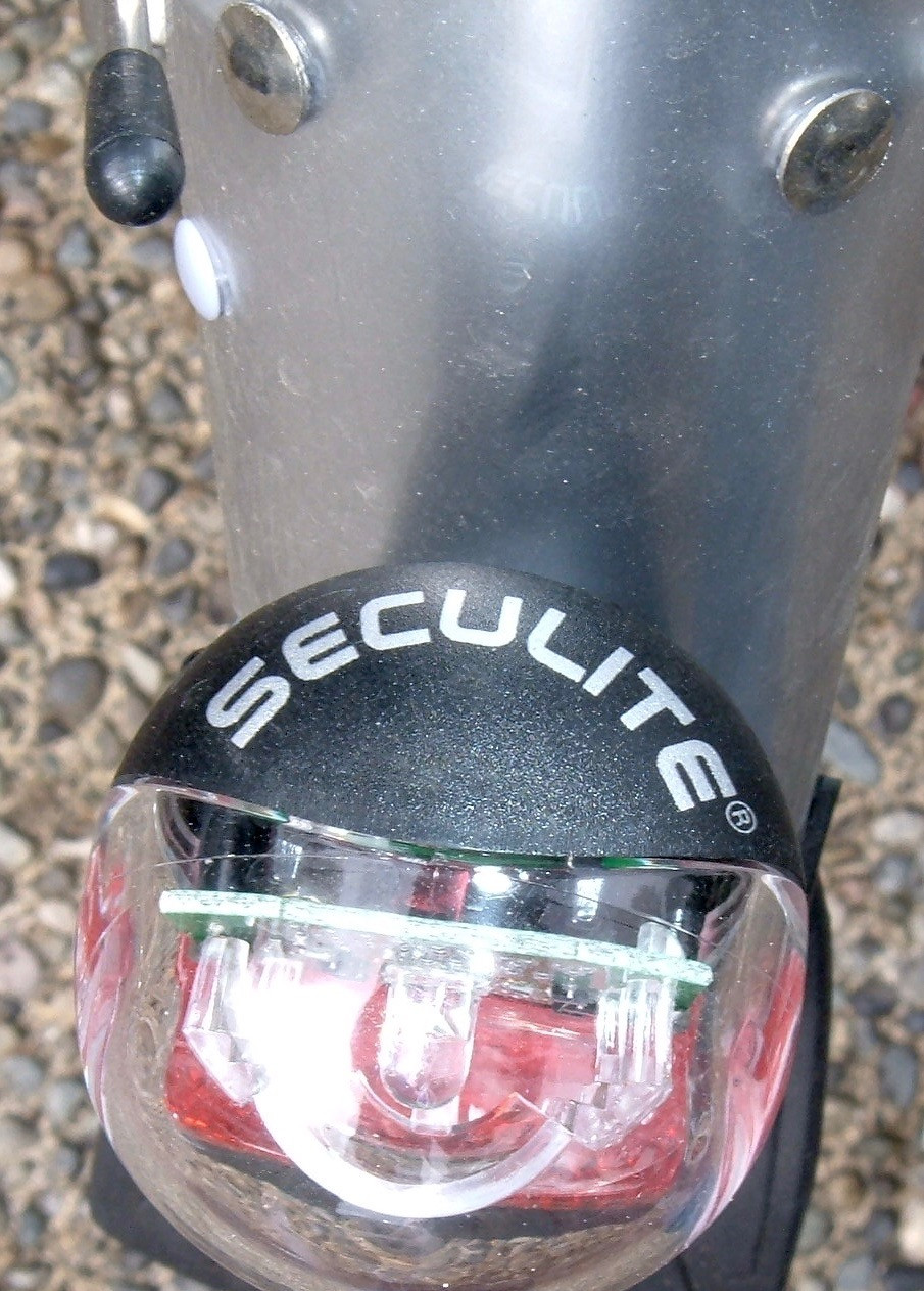 Finally, the rear LED tail light and reflector. Mostly, it’s a reflector. The tail light does glow somewhat, but it’s not very bright, and it goes out as soon as you stop moving.