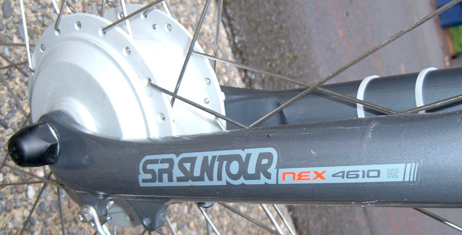 The front fork is an adequate SR Suntour Nex 4610 with adjustable preload and suspension lockout. Why you need suspension lockout on this bike is actually quite beyond me.