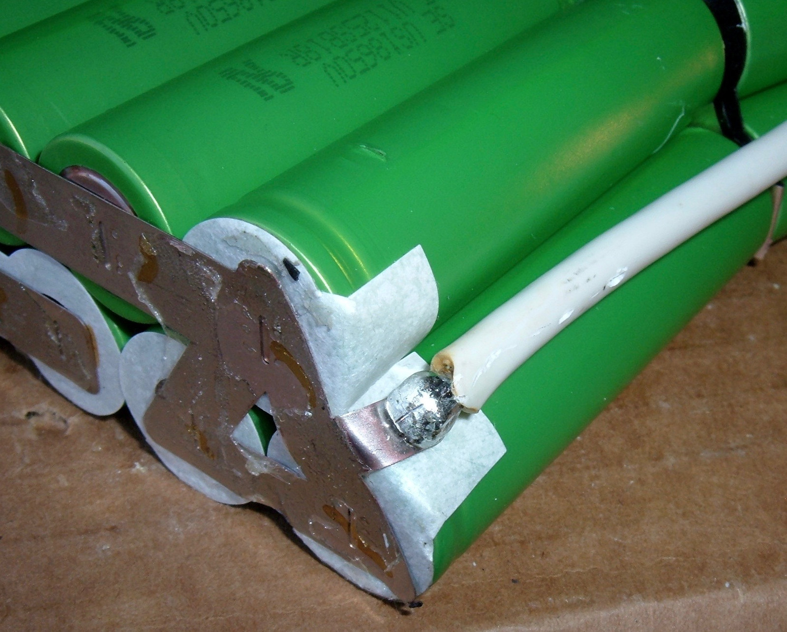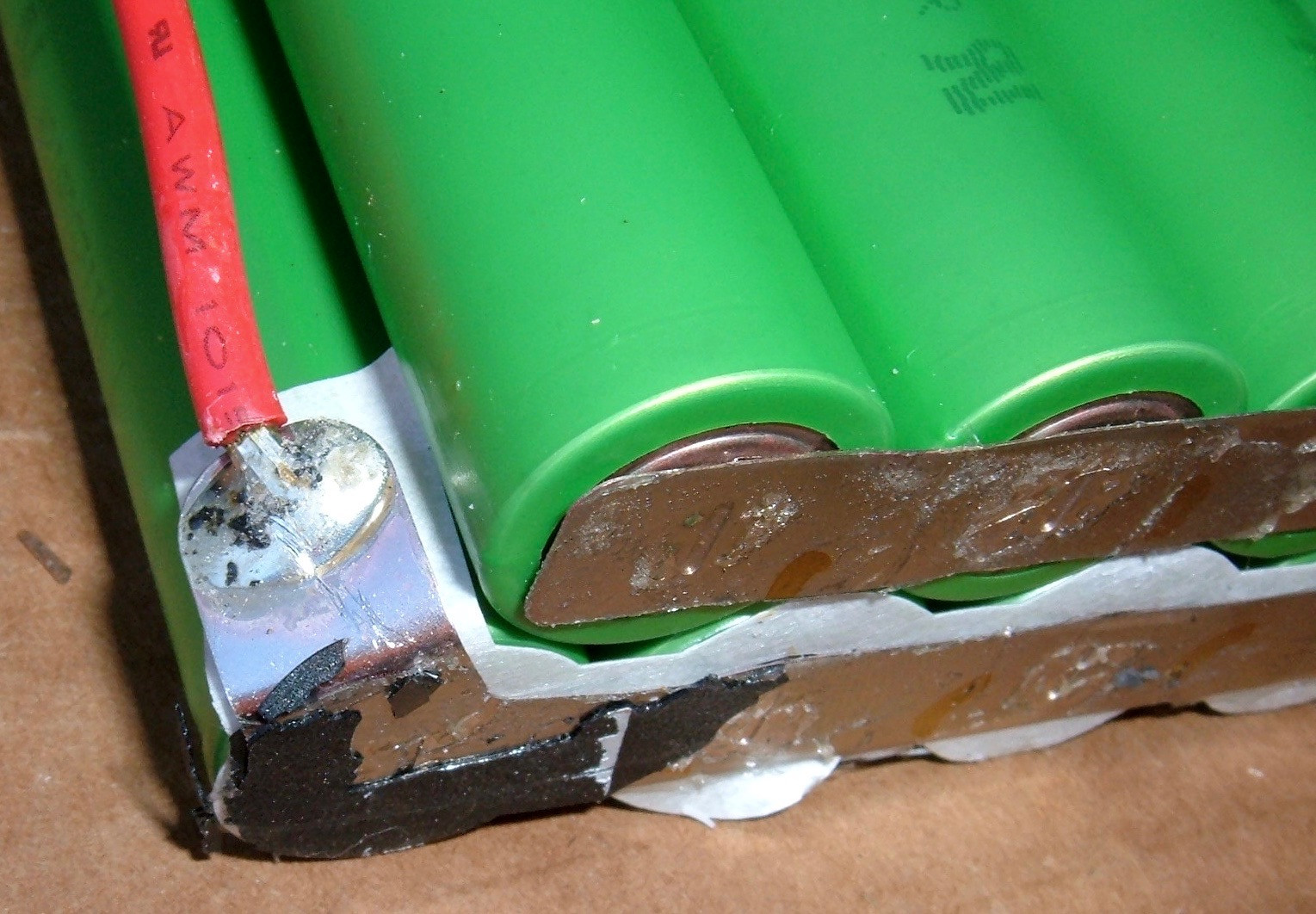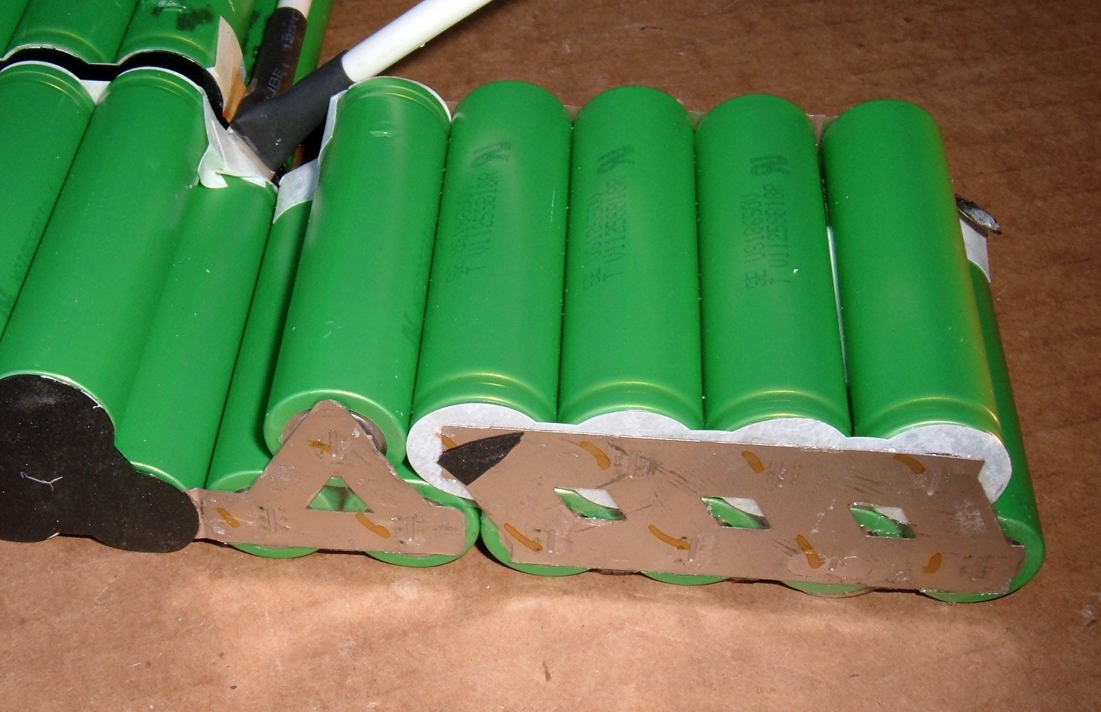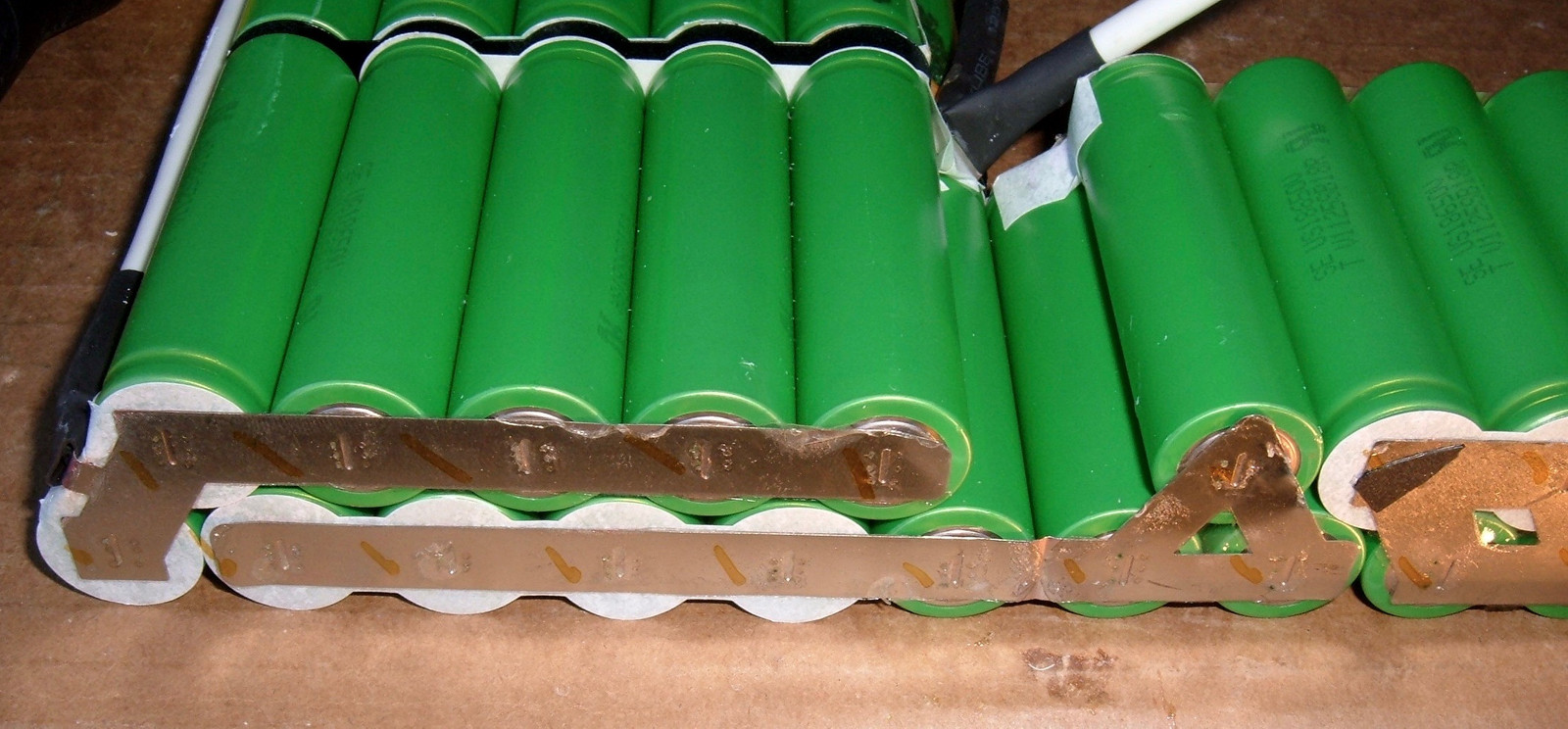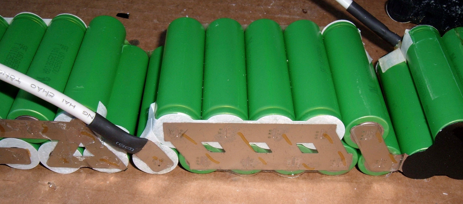 Also, you can (barely) see on the top cells that there’s a slit in the nickel strip over each cell. This improves the welding, and allows for a better weld joint with less current (as it forces all the current to go through the weld points and the end of the cell, instead of just bypassing through the strip).