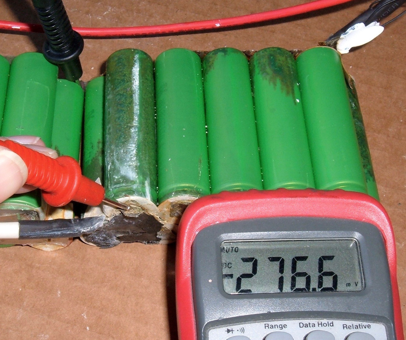 I’ve got the pack totally unfolded now. And I am incredibly curious about these corroded cells. So, out comes my voltmeter! I hook it up…