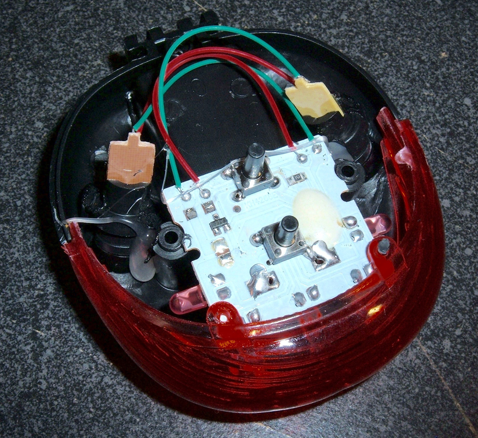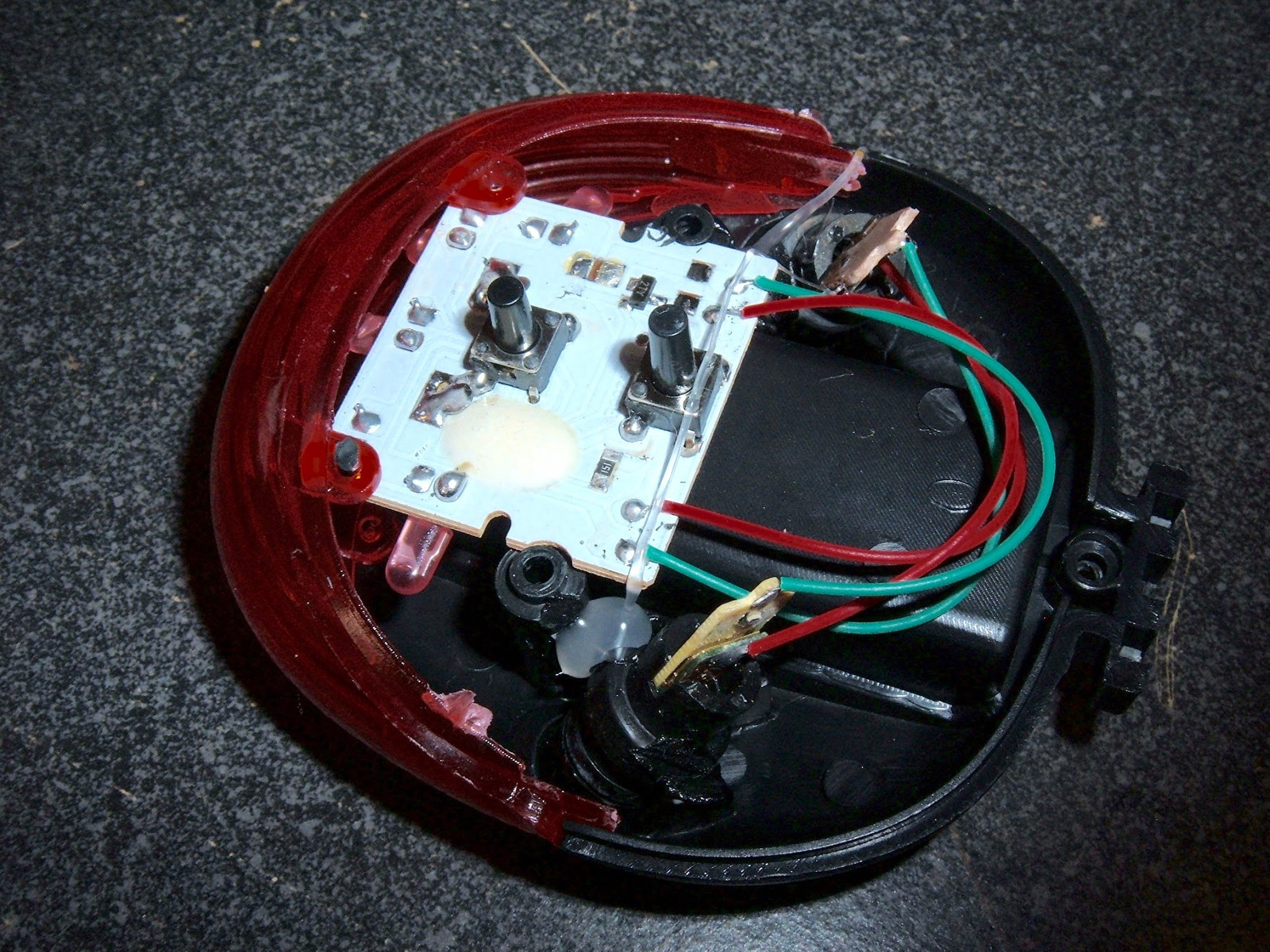 With the top off, the circuit board is visible. It has two pushbuttons (conveniently aligned with the external buttons for your button pushing pleasure), a bit of hot glue, and some wires going to two laser emitters.