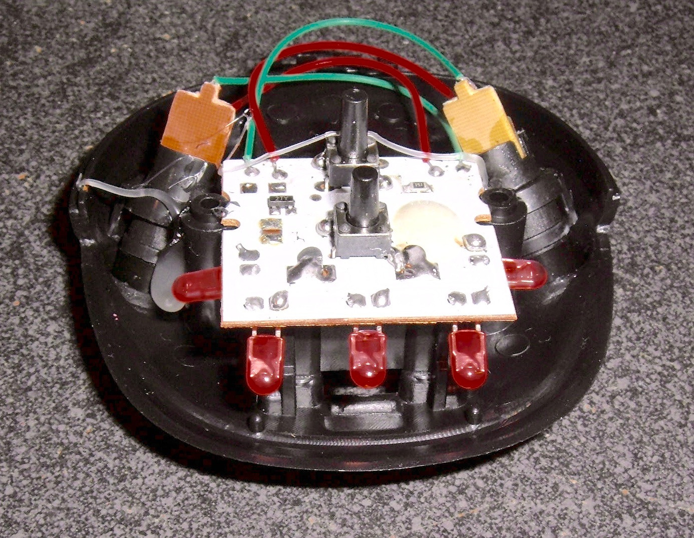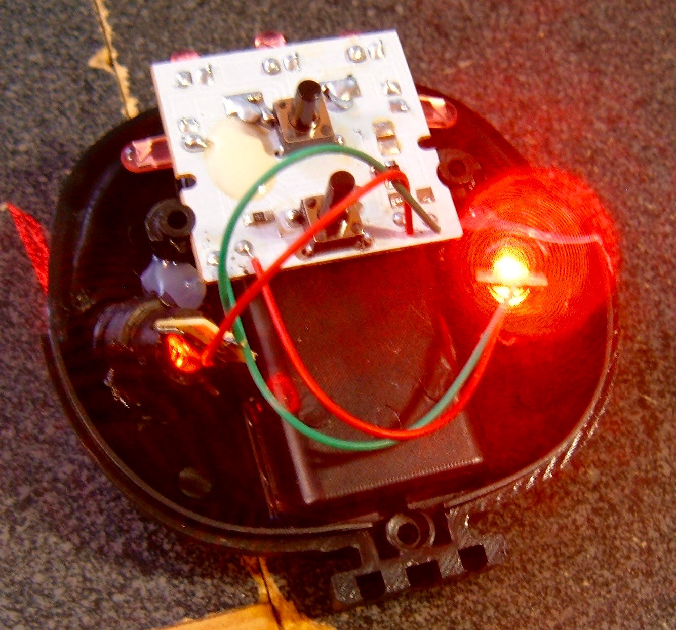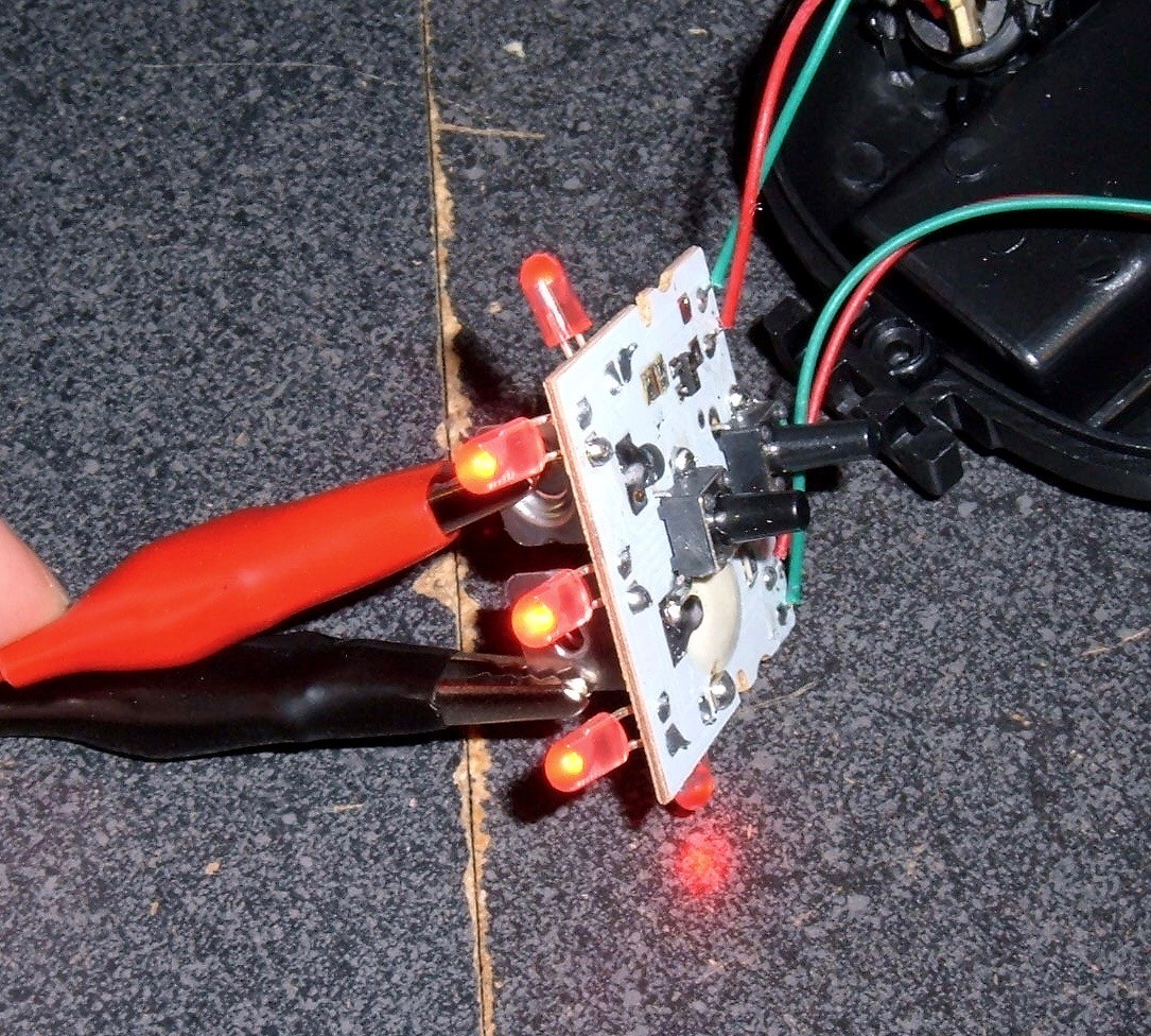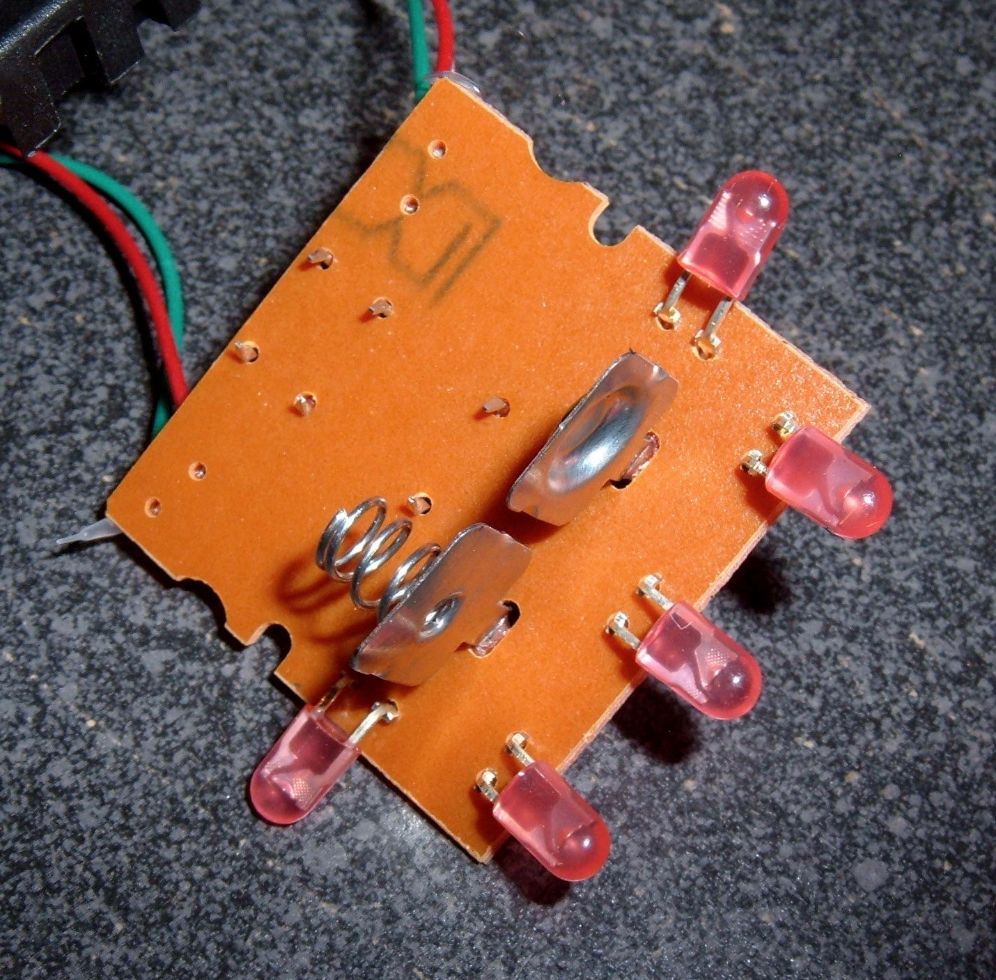 With the red lens cover off, the LED arrangement is clear. Five of them, soldered straight to the circuit board.
