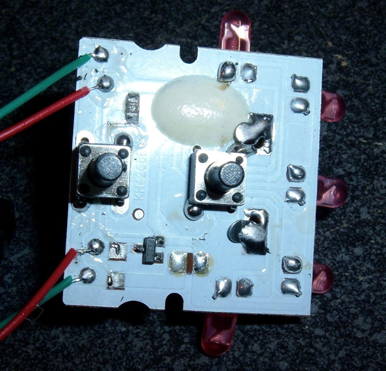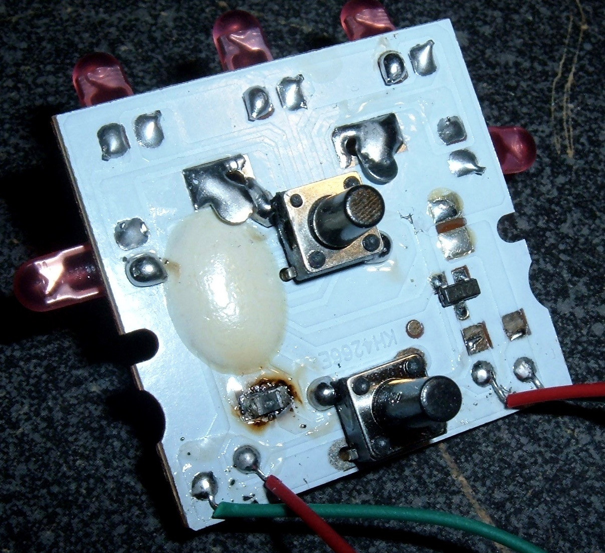 The board comes out easily - no snaps, and just a strand of hot glue in the way. It’s well secured when the unit is assembled, but once the top and lens are off, there’s nothing holding it in. The underside of the board is dreadfully boring. It’s just the LEDs and the paddles for the battery compartment.