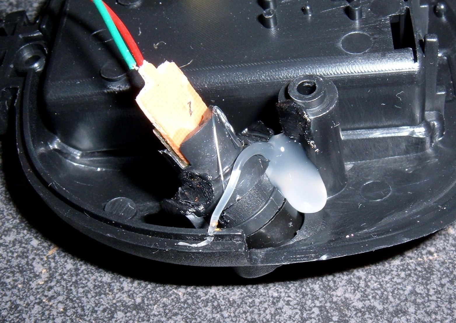 The laser emitters are wedged into small tubes, and the plastic is melted to hold them in position with some sort of hot blade. However, given how easily they came out once I removed the hot glue, this wasn’t enough, so a blob of hot glue is present on both sides. The hot glue holds them quite securely.
