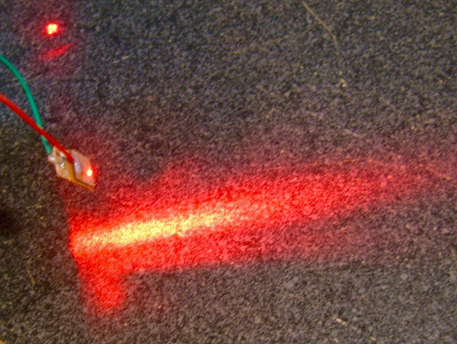 And here’s what the output looks like without the collimating lens in place. The top spot still has the lens, obviously. I’m no expert, but I’d say that bottom emitter definitely needs collimating!