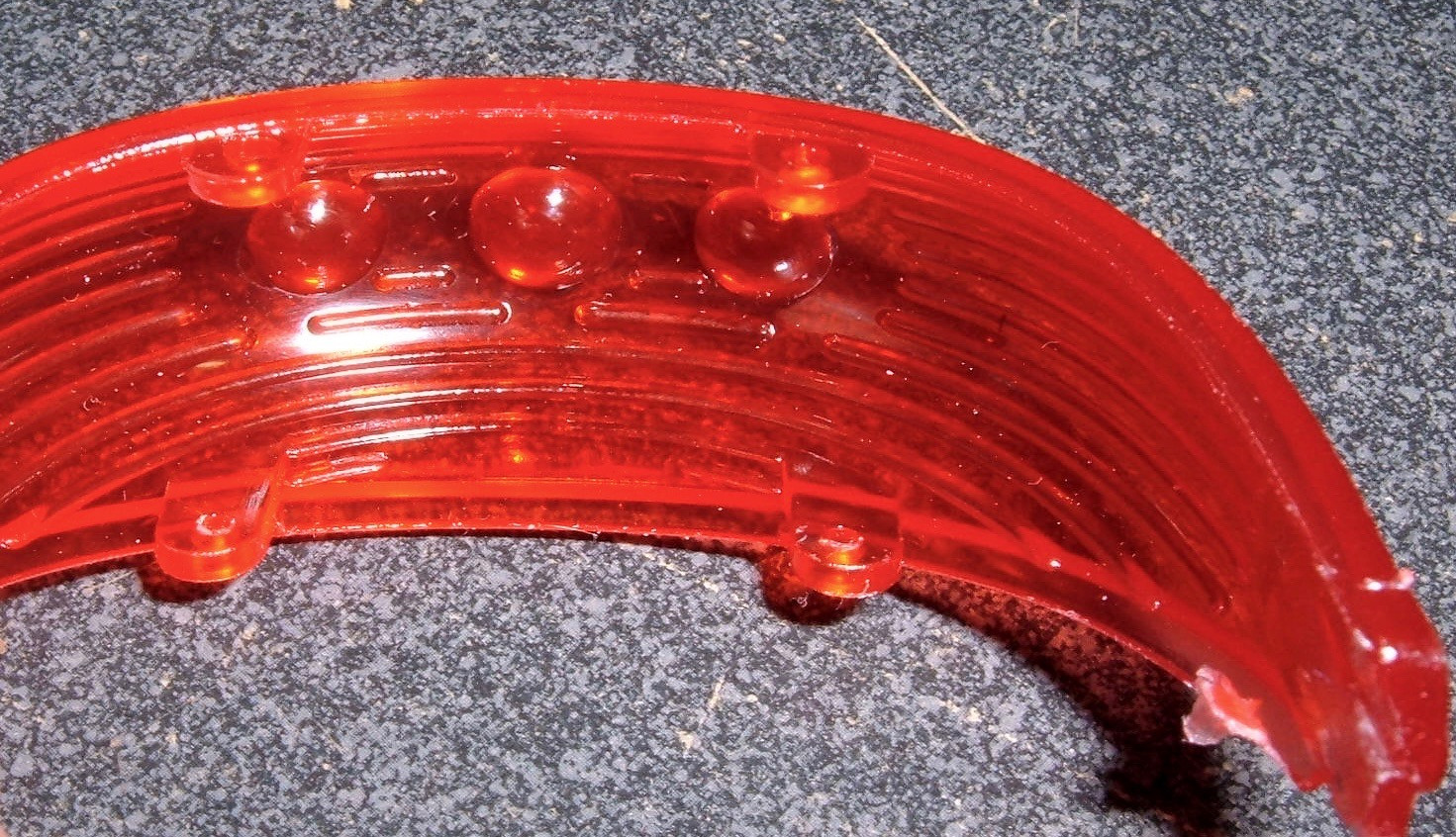 The lens is just colored plastic. It’s got some blobs molded into it to help focus the LEDs (perhaps), and a bunch of ridges that help scatter the light and make the bike more visible. It actually works surprisingly well.