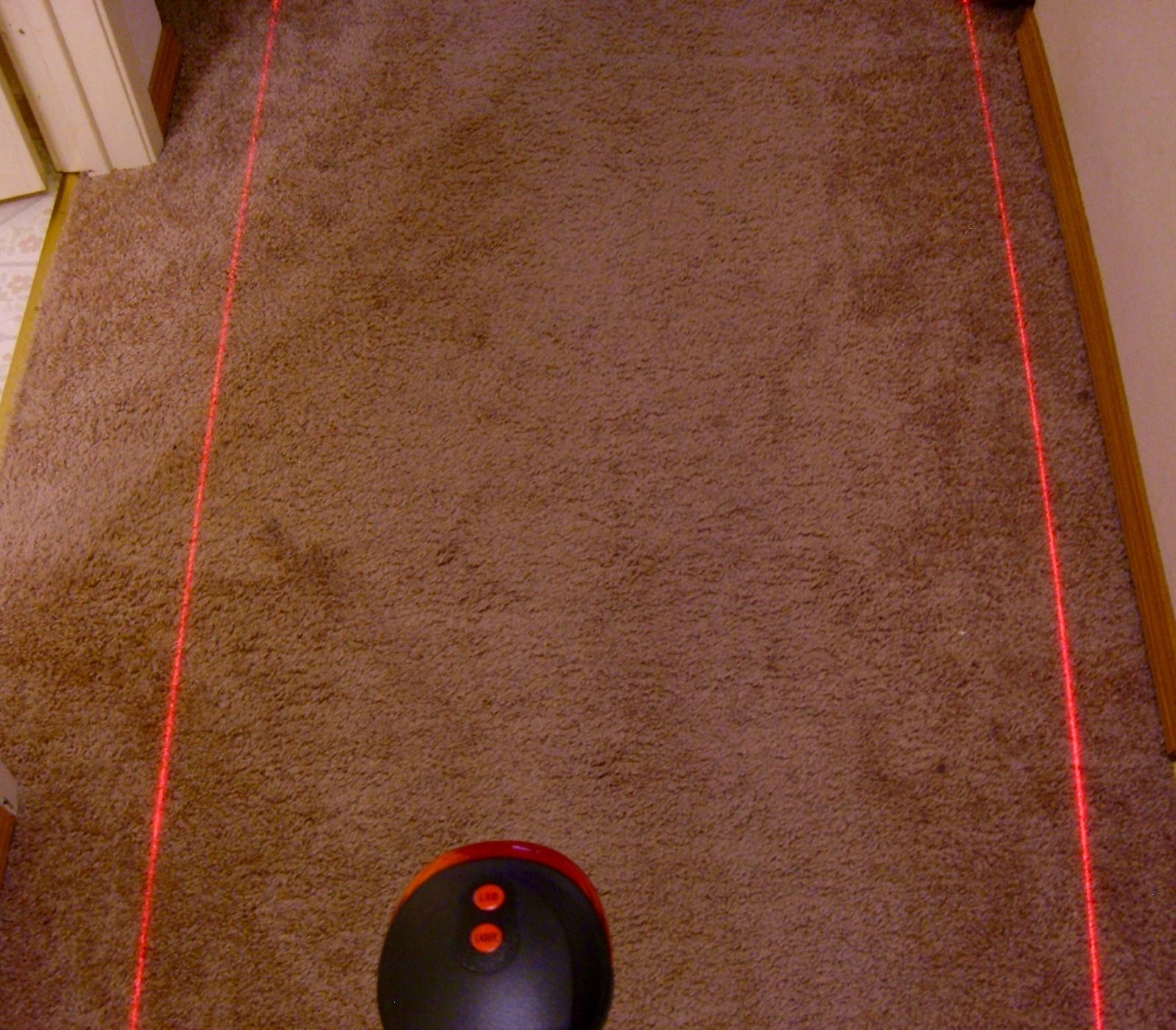 The lasers are surprisingly bright. This is a slightly dim indoor environment, and the beams are clearly visible with the unit at waist height.