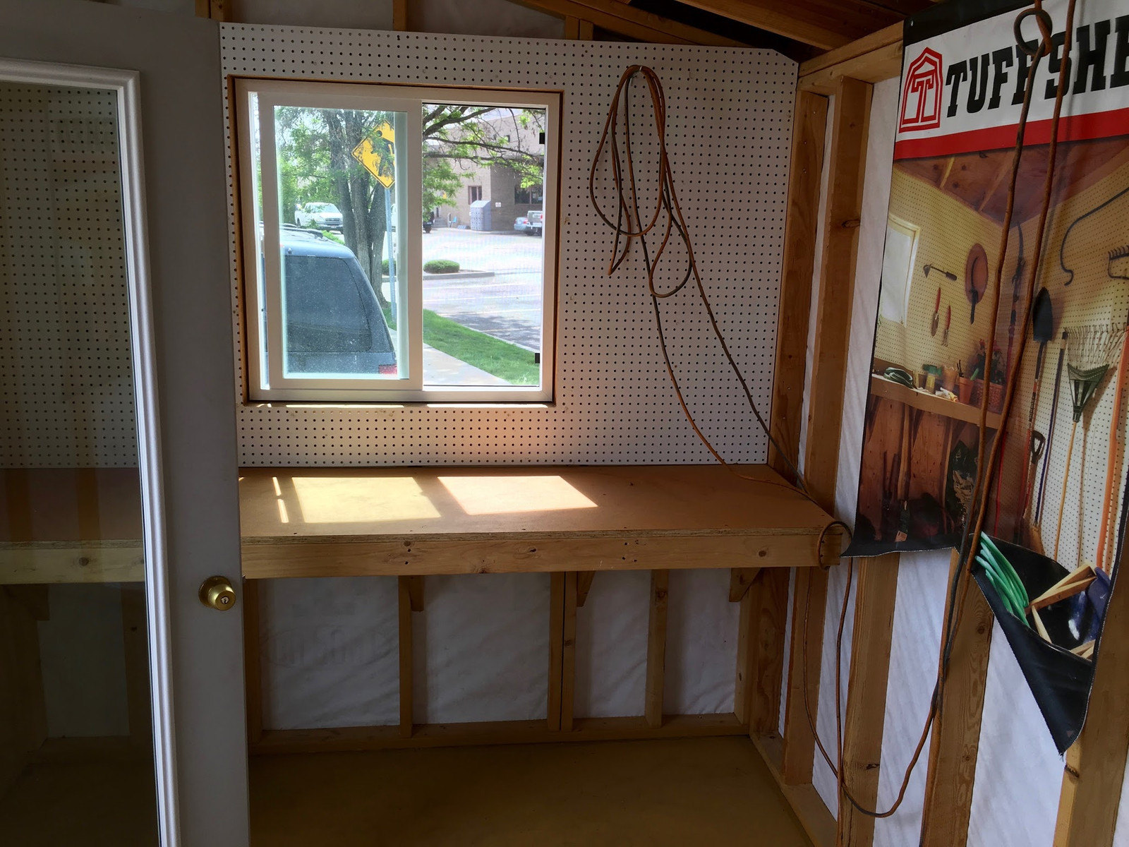 The left side comes with a very nice pegboard and workbench installed. Sadly, they’re in the way of installing insulation, so they have to get removed. I like the concept, though, and will eventually do something similar.