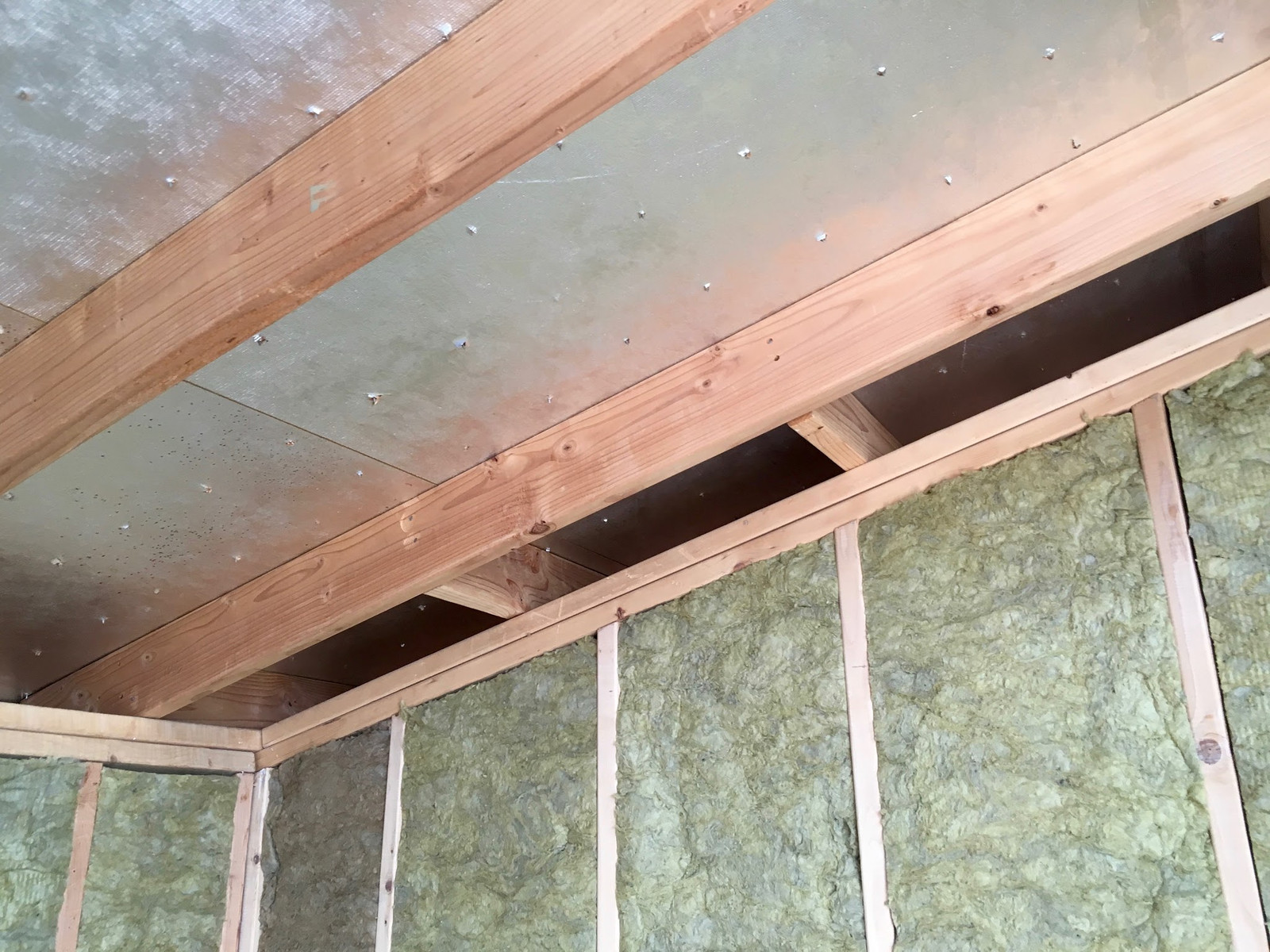 Here’s what I’m starting with overhead. It’s a shingled roof, built on 2x6 rafters, 24” on center. The sides are broken into smaller compartments, and there’s a radiant barrier on the inside (the silver layer). My plan is to stuff it full of insulation, just like I did the walls!