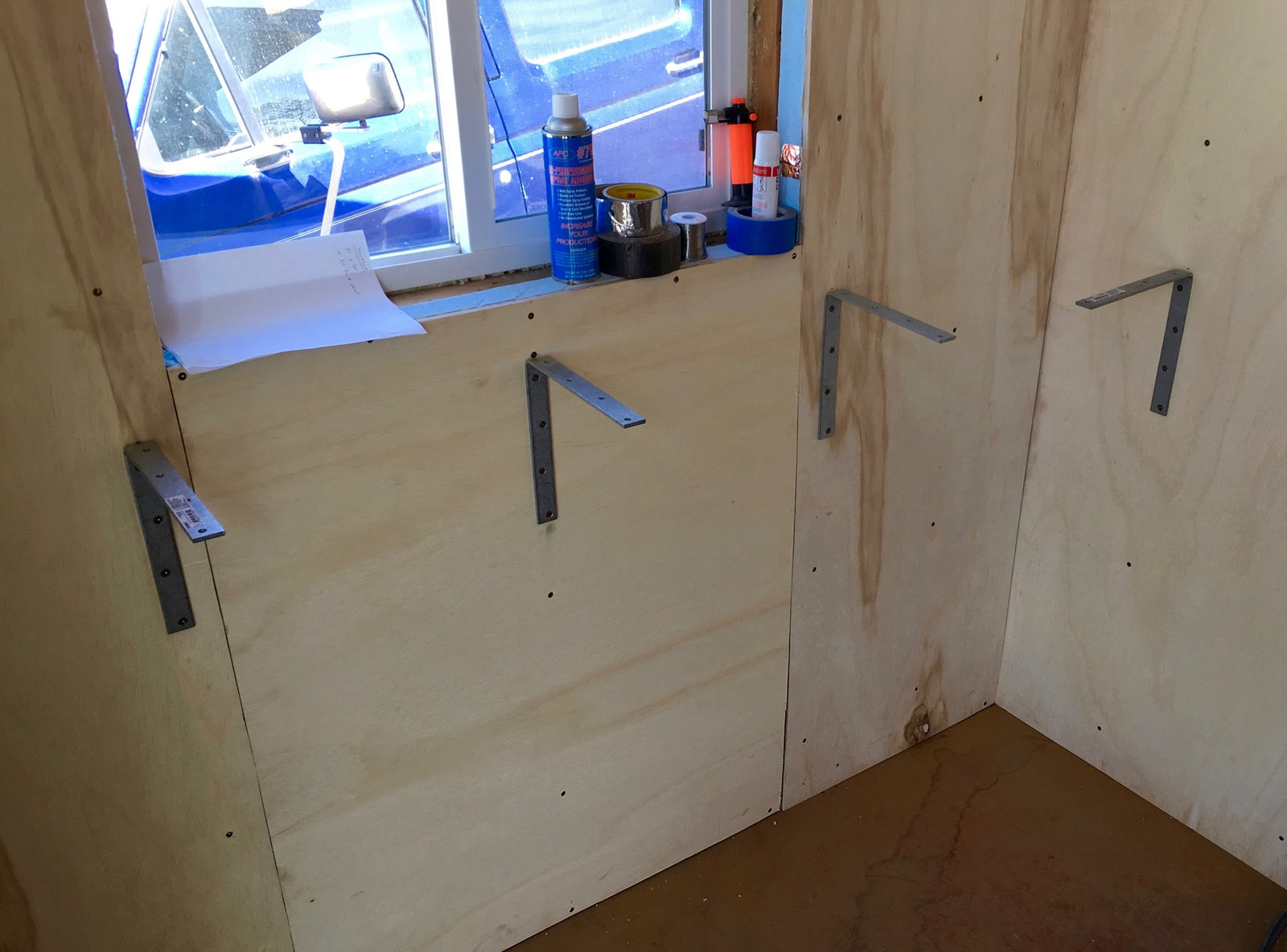 The positioning of these, if you notice from the screws in the plywood walls, is such that they’re anchored into the studs. I see no downsides and significant upsides in terms of anchor strength, so into the studs they go.
