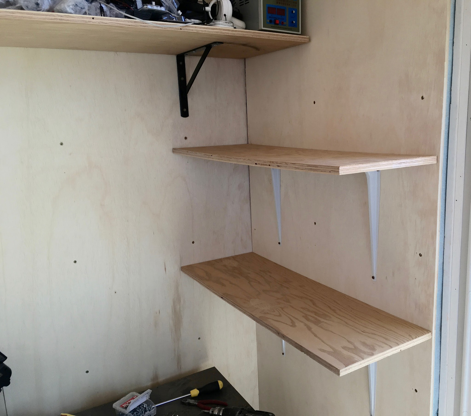 So I installed some. The shelves are, like the bench, just 3/4” plywood, cut to size, and stuck up with shelf hangers. Nothing fancy, but it should get the job done. I didn’t bother with stud finding on these - they’re just screwed into the plywood. None of them are going to be handling anything particularly heavy.