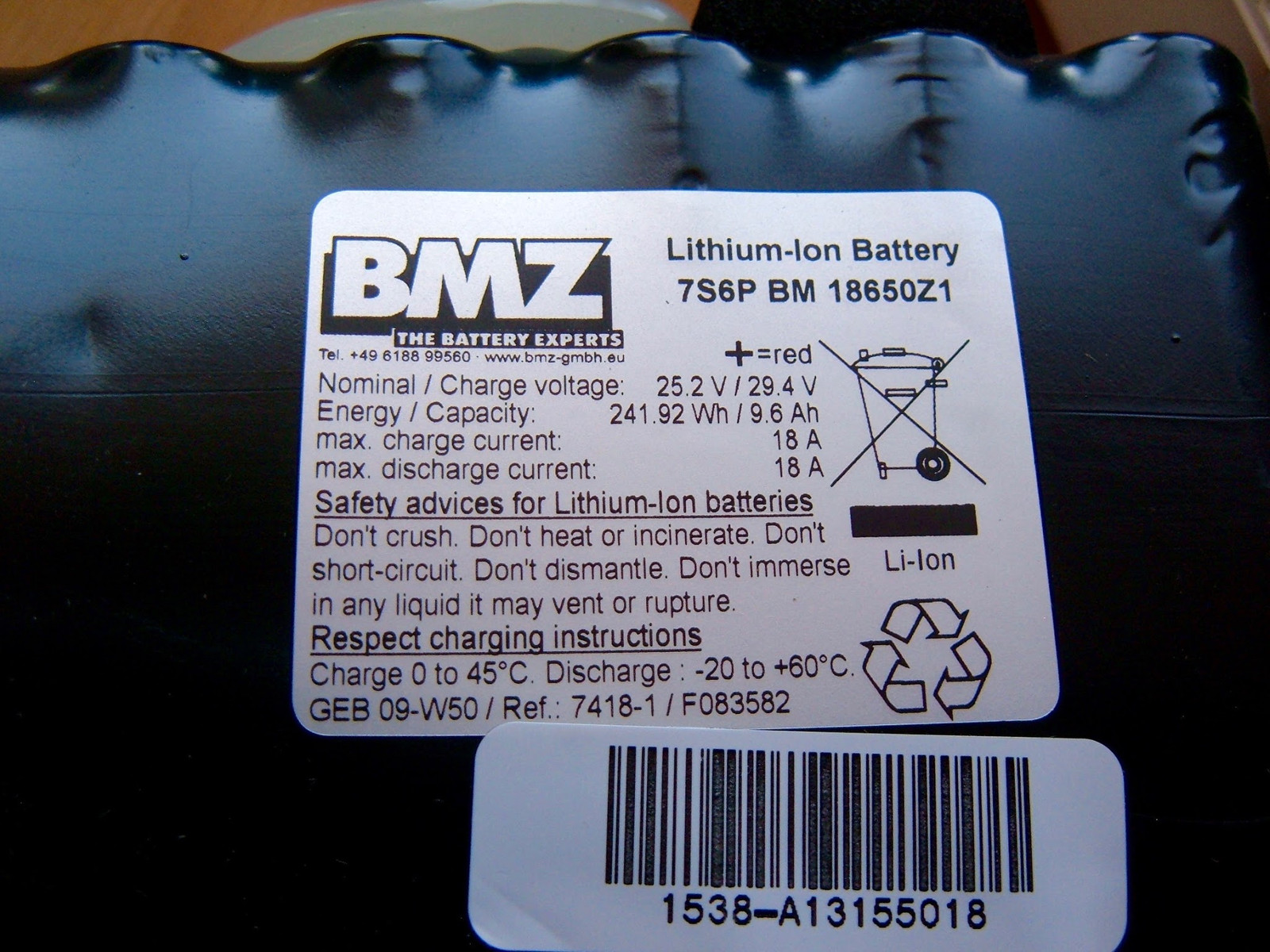 This tells me it’s a BMZ 7S6P pack (7 cells in series, 6 cells in parallel for each group), with a nominal voltage of 25.2v (3.6v/cell), and a fully charged voltage of 29.4v (4.2v/cell). A 6P pack with 9.6Ah capacity means 1600mAh per cell - so it’s almost certainly 42 of those cute green Sony US18650V cells.