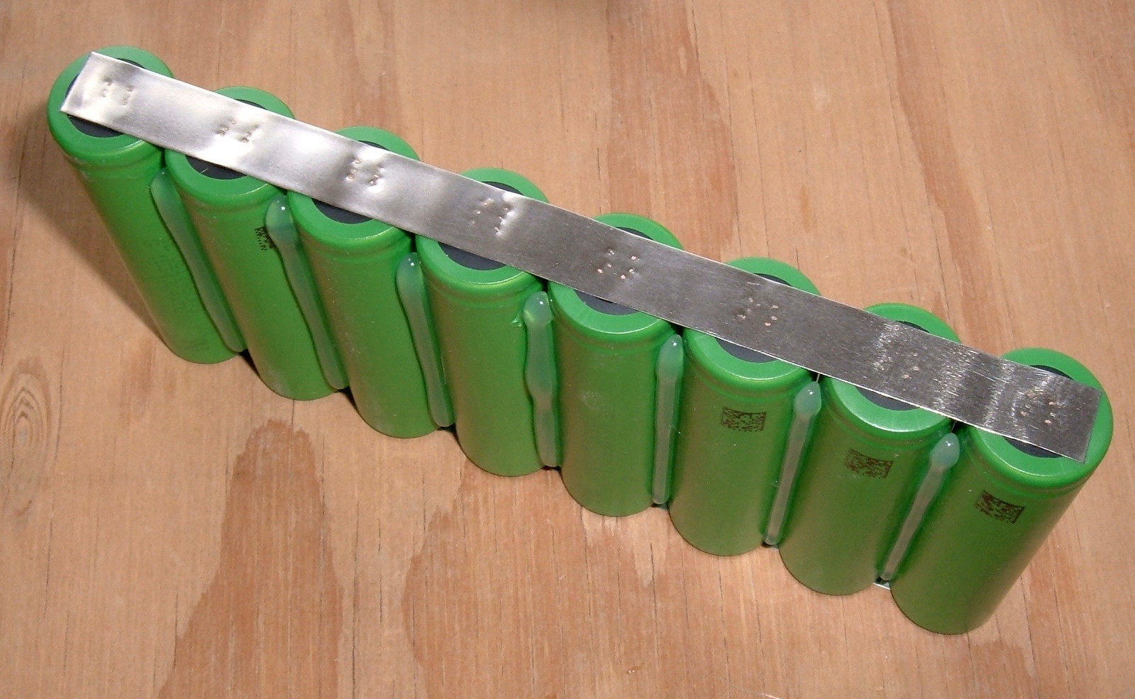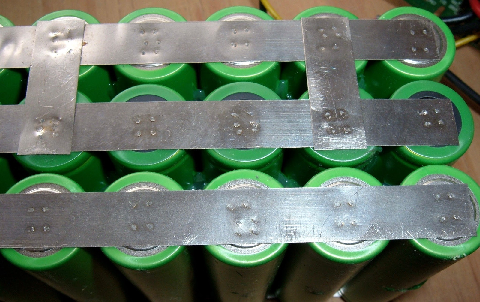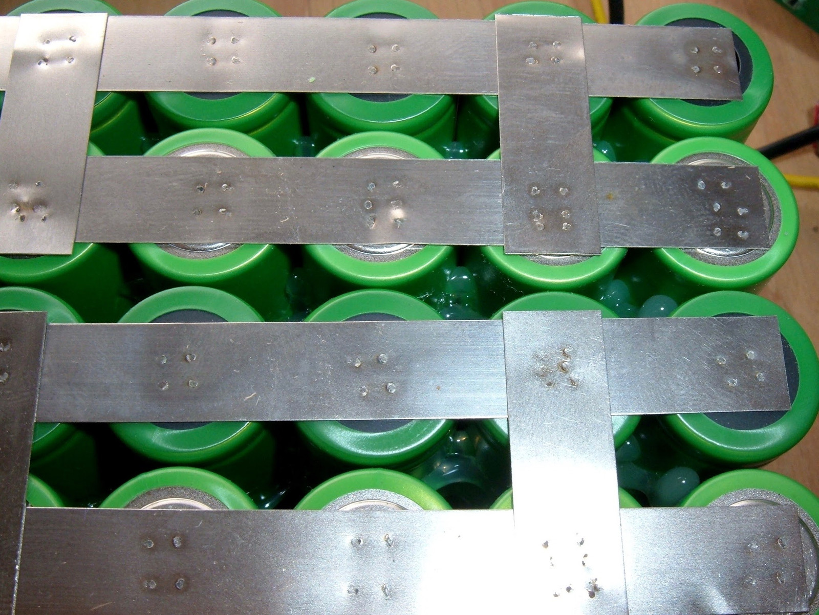 Once the groups of 8 are glued together, it’s time to group them electrically. Out comes the nickel strip and my spot welder.