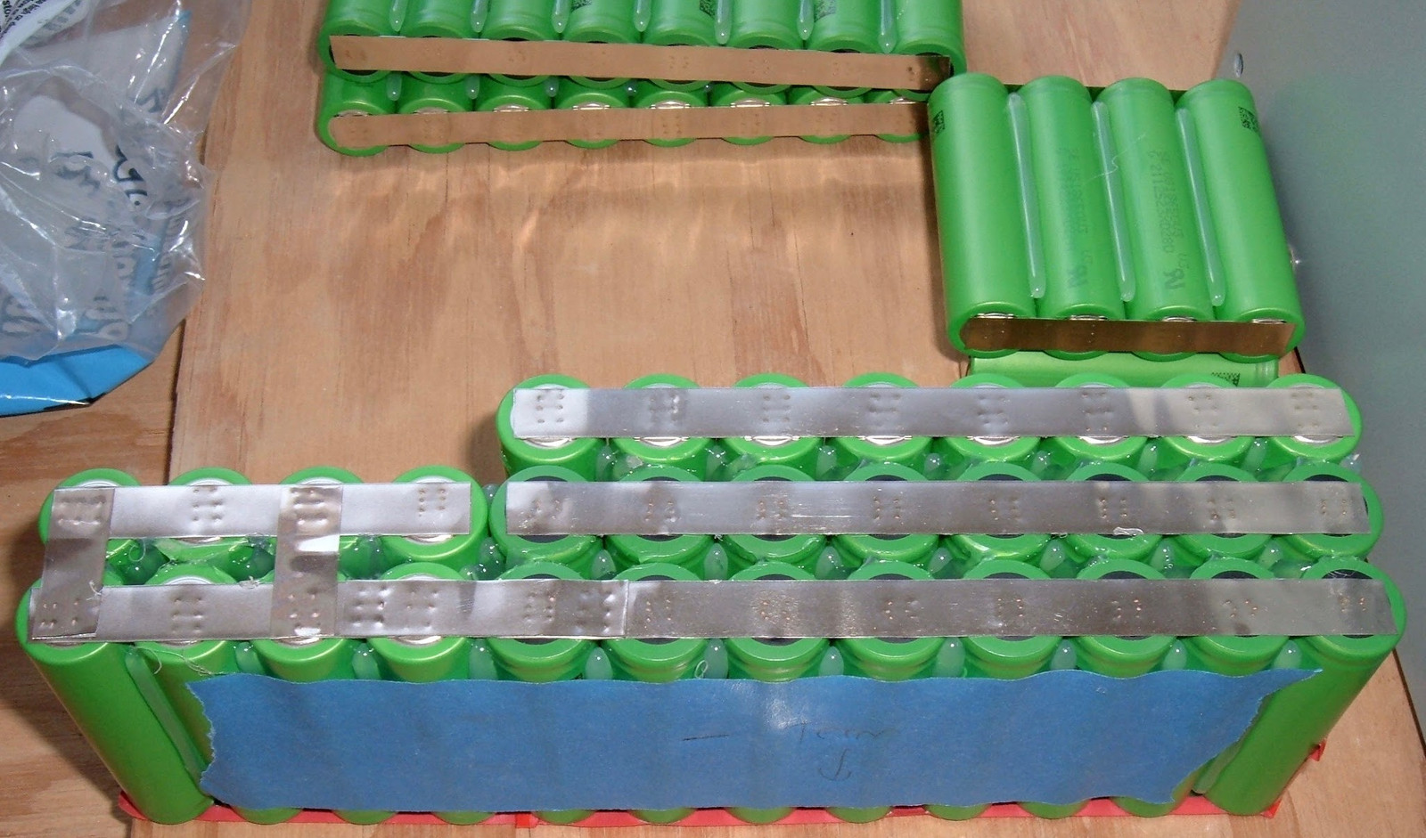 Importantly, one should insulate once one no longer needs access to voltage regions. These cells are at shipping charge (3.61v), but they’ll still source more than enough current to spot weld any short they get the opportunity to.