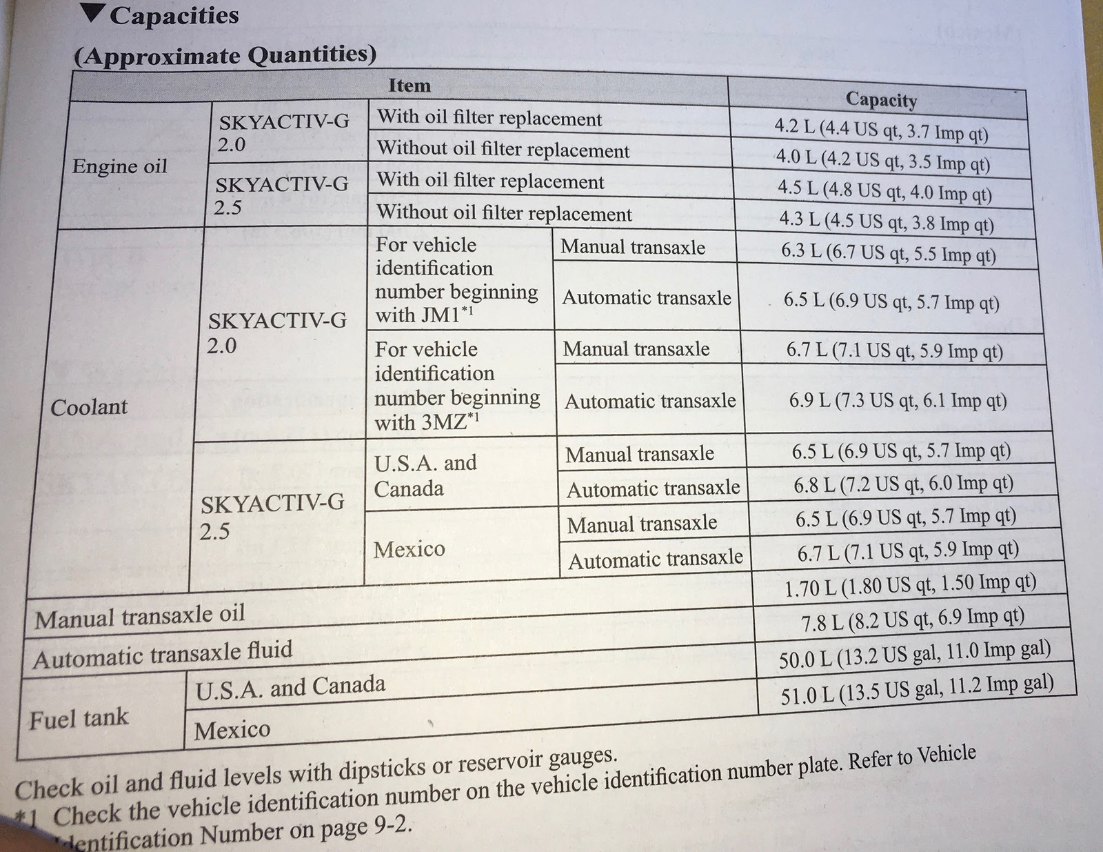 SkyActiv-G 2.0, without oil filter: 4.0L, 4.2 US qt, 3.5 Imp qt.