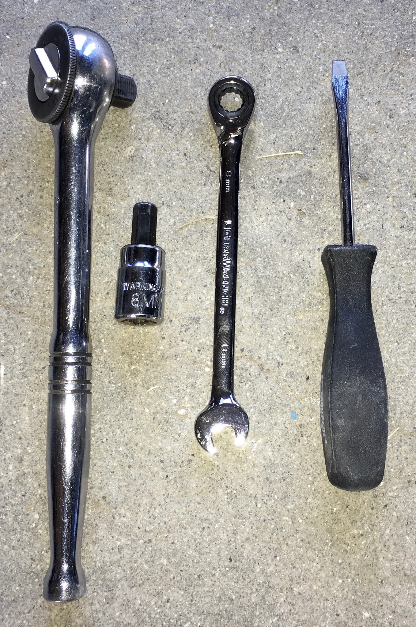 In addition to a jack and two jackstands, you’ll need an 8mm wrench, an 8mm hex driver (an Allen wrench probably isn’t long enough for the torque needed), and a small flathead screwdriver.
