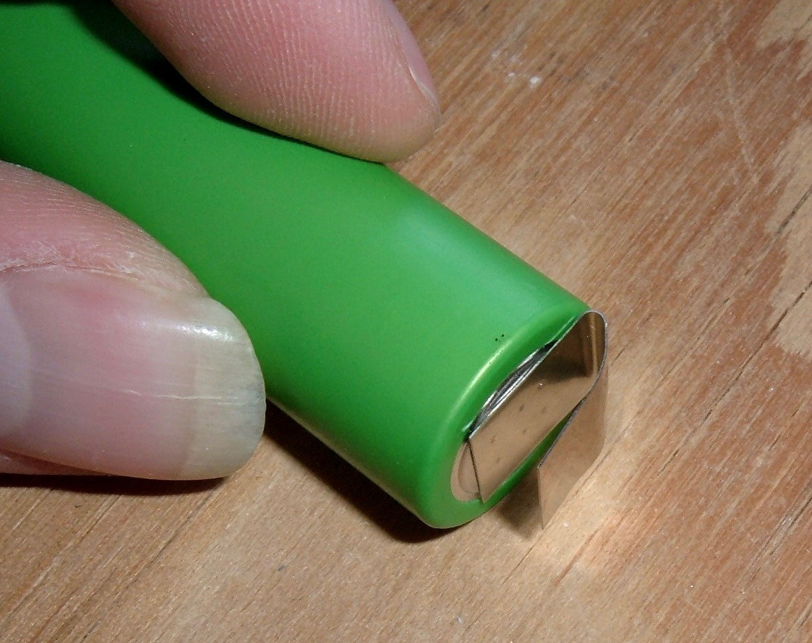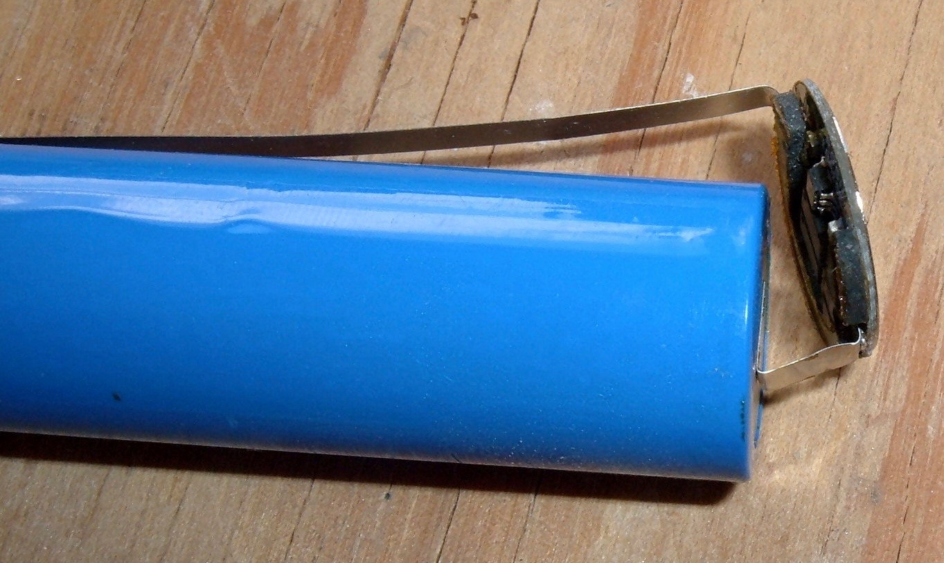 A non-protected 18650 (in this case, a Sony US18650V3, because I have a lot of them laying around) is too short to fit in the flashlight and make contact. So, I used other things I have laying around (nickel strip and my spot welder) to create an extension on the end. Why the negative end? It’s easier to weld to by some tiny fraction.
