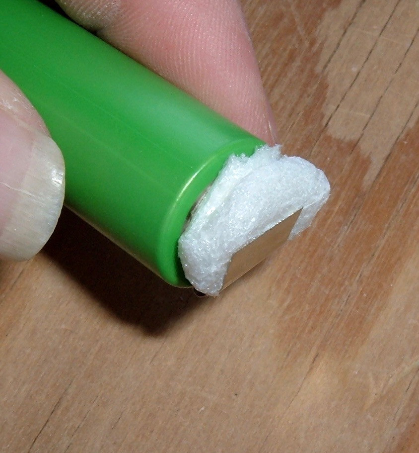 If I left it there, it wouldn’t remain in contact after getting rattled around. So, I found some convenient squishy material (one of those dissolving packing peanuts) and stuffed it in.