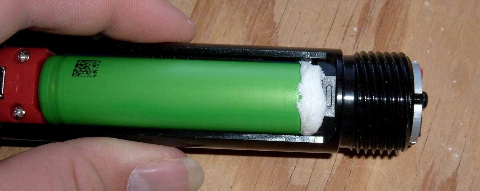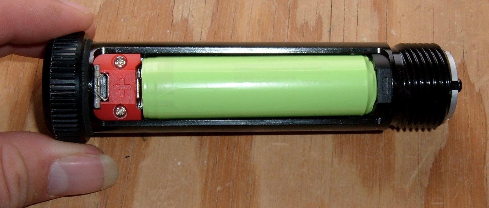 One problem is that the design of the battery holder is very, very touchy. The flashlight fits the provided battery like a very tight glove, but protected 18650s vary in length by more than a little bit, and it’s nearly impossible to find one that specifies the exact length accurately. Of course there are no HexBright replacements available.