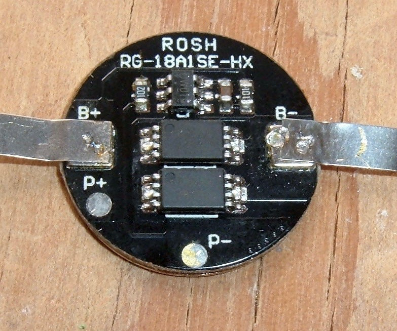 With the rest of the wrapper off, it’s a bog standard protected 18650. The metal on the side goes to the positive lead, the battery “protection” board lives at the bottom, and there’s a bit of foam rubber adhesive between the battery and the board.