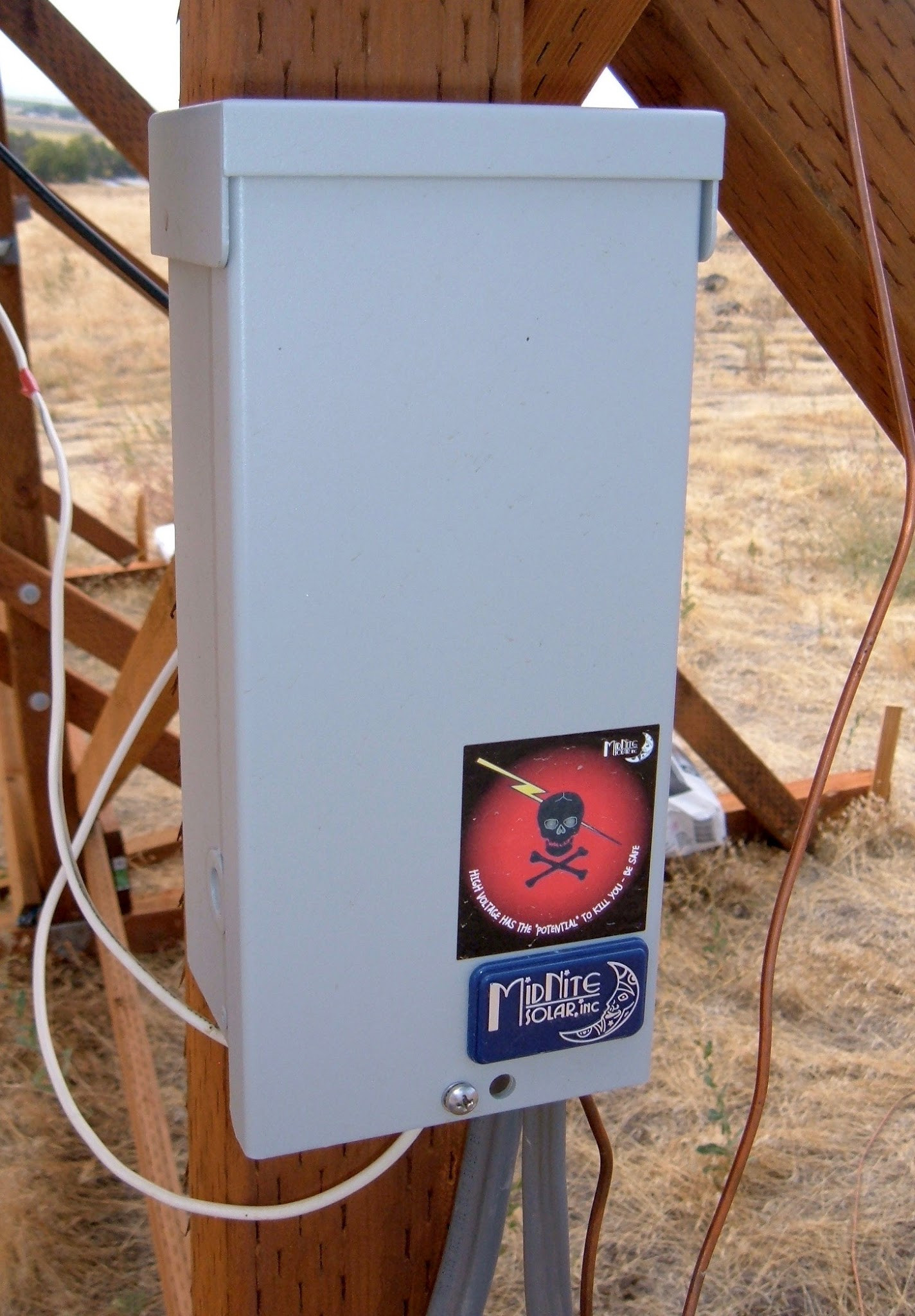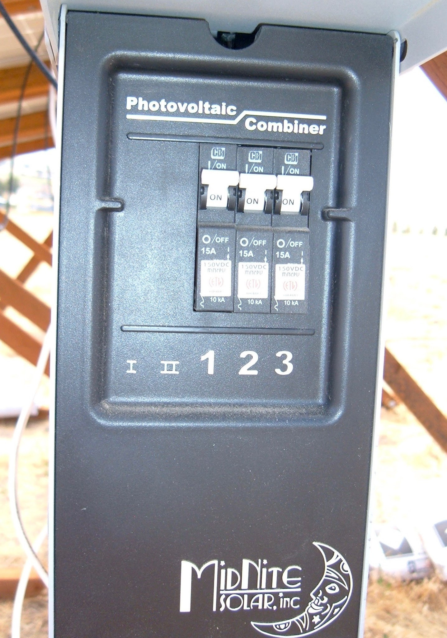 The wiring off the string of panels feeds into a Midnite Solar combiner box. This box holds breakers for each panel string (really, more of switches), and combines the current from all the strings together to feed into my shed.
