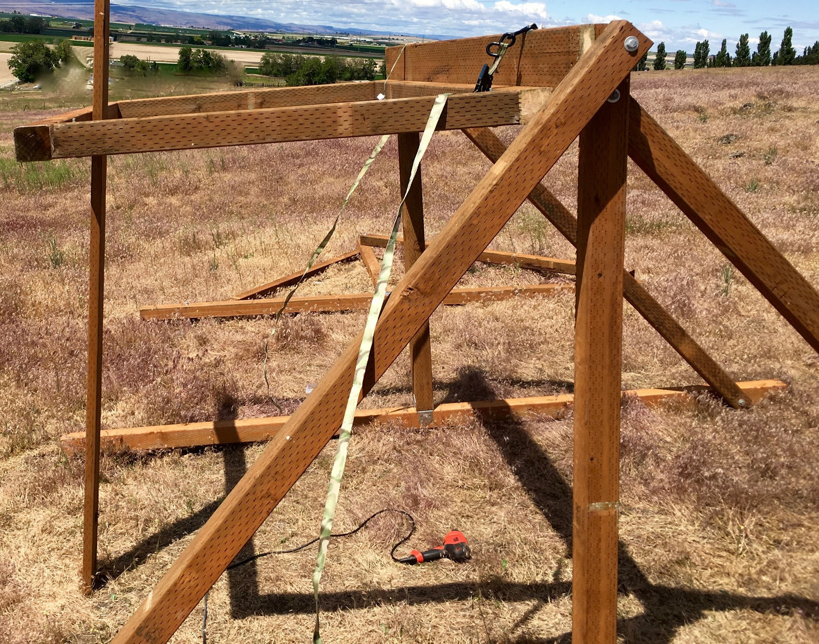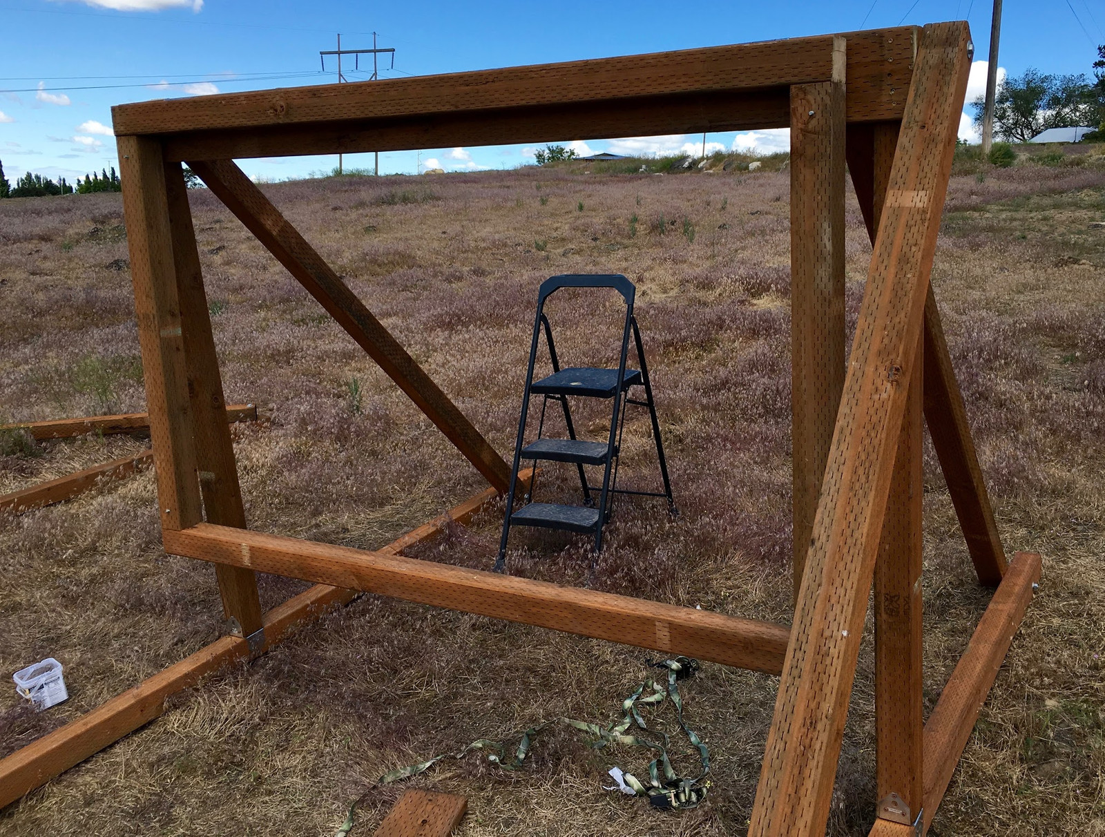 Here’s the final result. Note the wooden stakes driven into the ground. Those help keep it from moving. There’s also a few hundred pounds of sandbag on it, helping to keep it from moving.