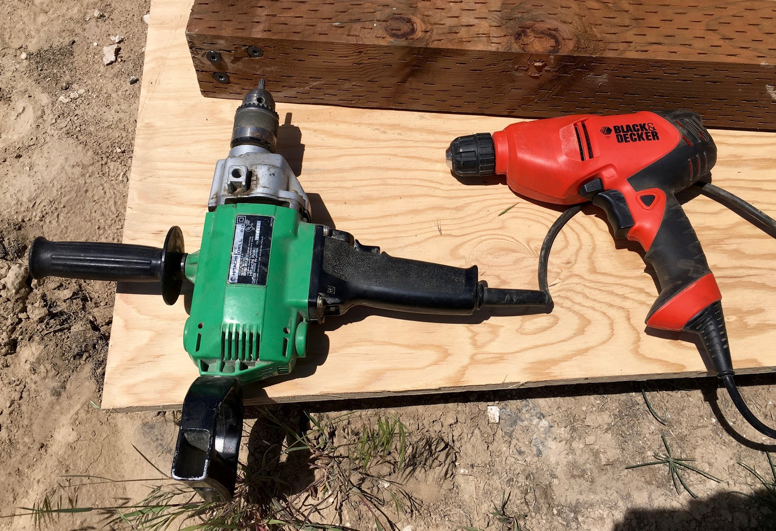 I borrowed a much larger drill from a neighbor. It’s a Hitachi 1/2” drive, single speed, ancient, and is more or less a peer to the generator I used for the foundation.