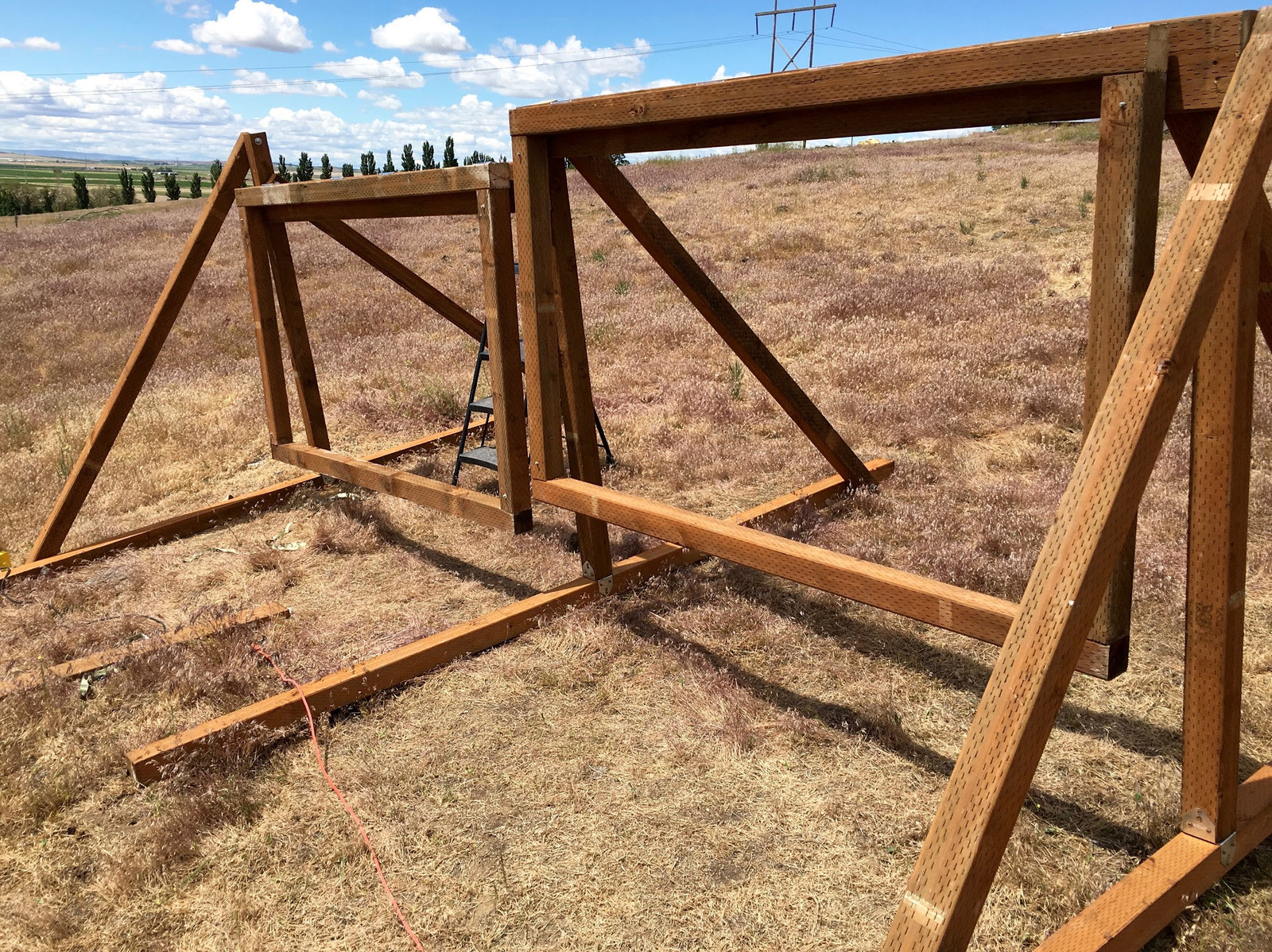 Across the top, a 2x8 crossmember holds everything in place and serves as a place to mount the panel swings. I’ll brace the structure diagonally once everything is finished and I have it staked down.