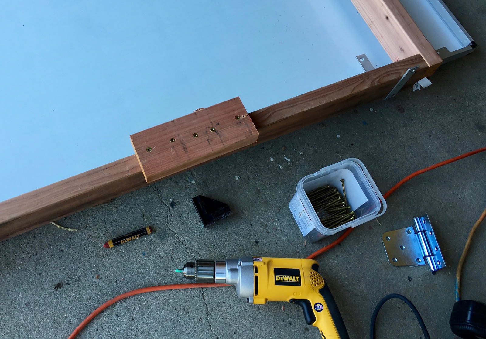 I also got smarter on this set and mounted the hinges part way down! It’s not exactly at the center point, but it’s a whole lot closer than the previous panel mounts. This means that I don’t have to lift the whole panel to swing them - they’re partially counterbalanced. To offer the hinges a place to mount, I secured a chunk of 2x4 rather well into the frame.