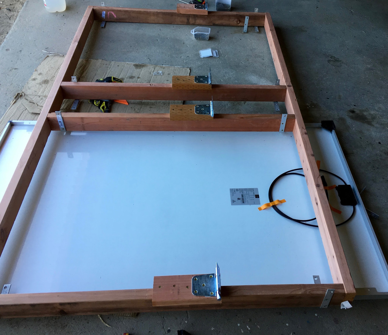 The panel swings are also lighter. I built them from redwood 2x4s, and used angle brackets to tie into the panel frames. This gives a bit more mounting flexibility - the angle brackets can shift slightly as things move, so hopefully this will stress the panels less. There are four mounts per panel, so I’m not concerned about raw strength.