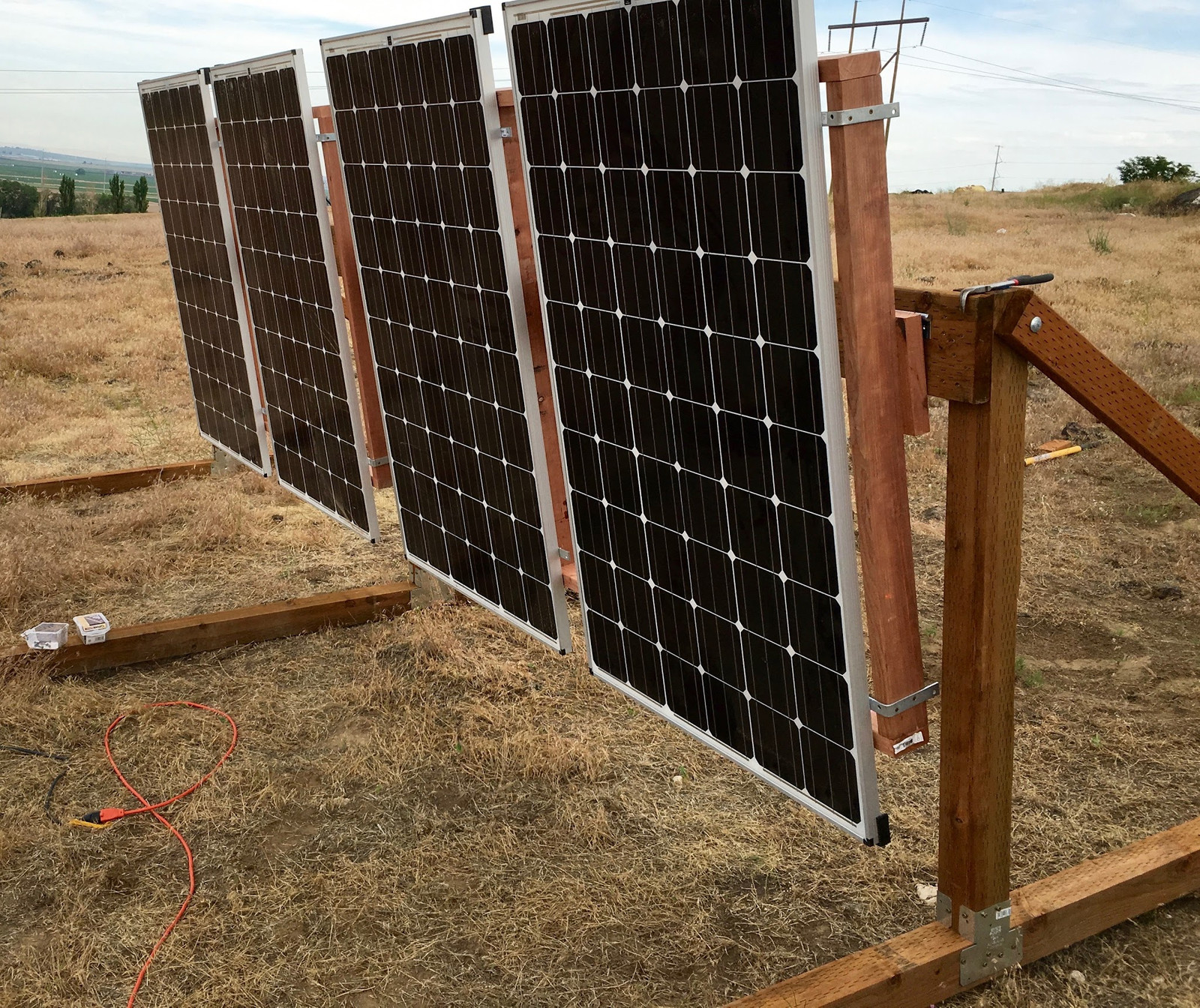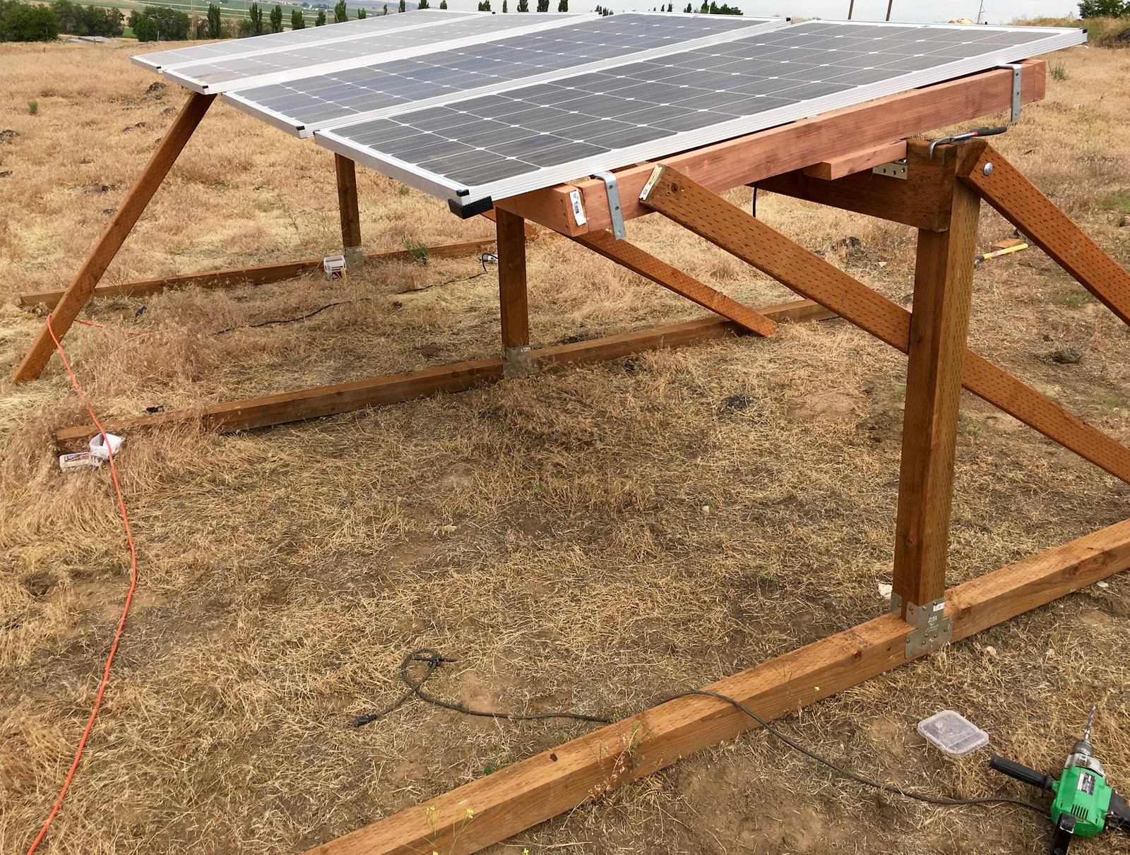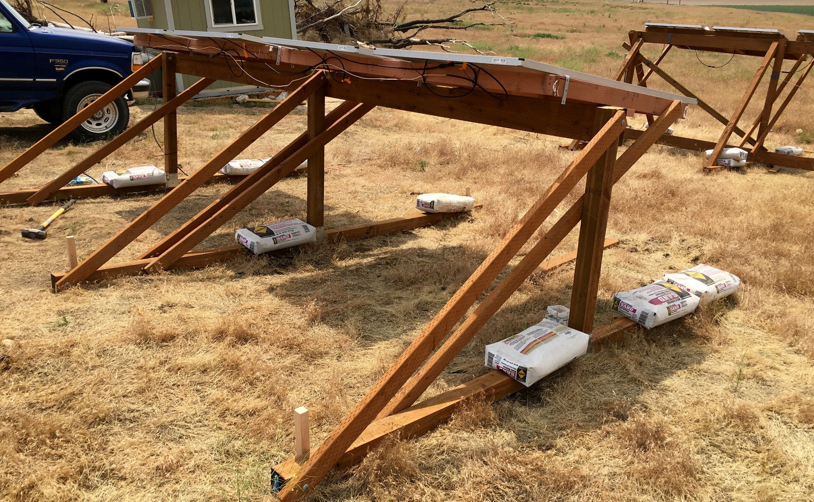 Finally, with the addition of some 2x4 supports, the panels are up at the summer angle.
