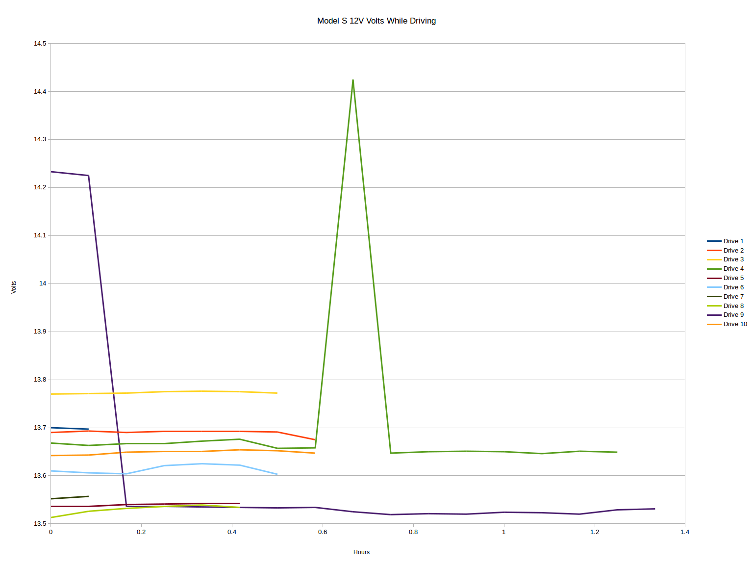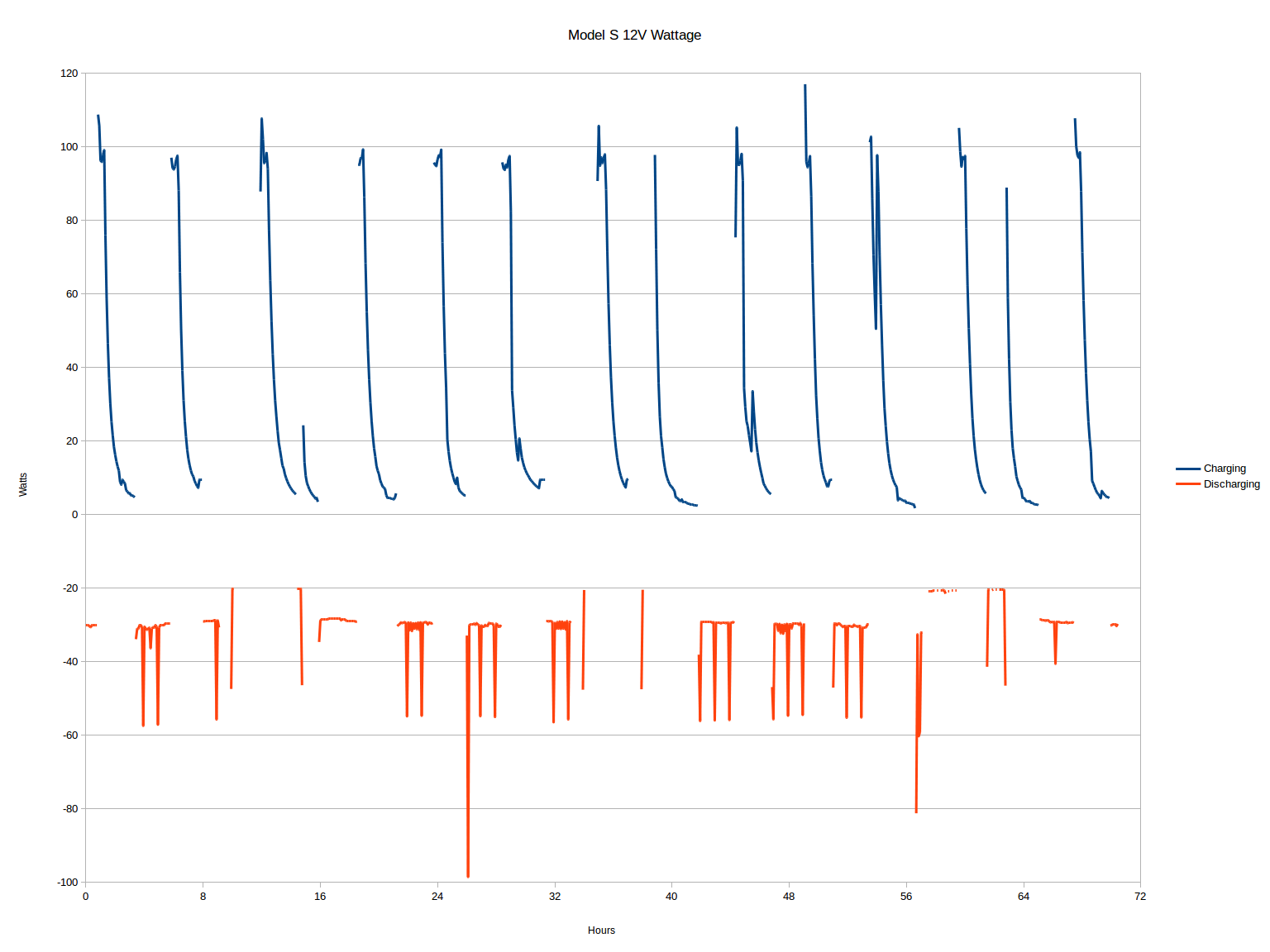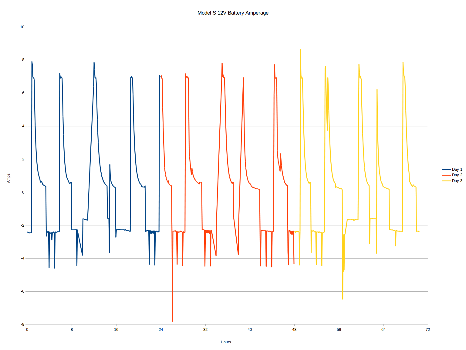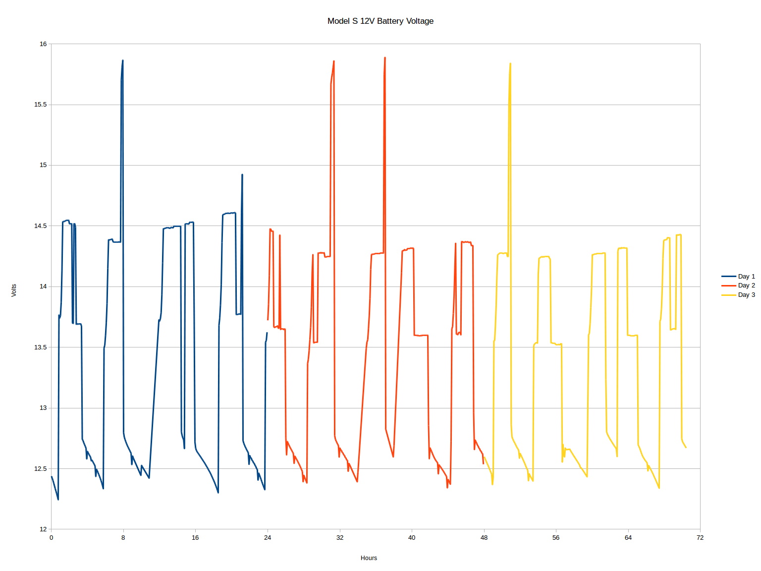 I’ve got, on my flash chips, this tiny little file that, on analysis, turns out to be a few days worth of data log from a Model S 12V battery system in late 2016. Voltage, amperage into or out of the battery, and some surrounding data about charge state and the like. Rumor has it that the power settings are “Energy Saving : Off” & “Always Connected : On.”