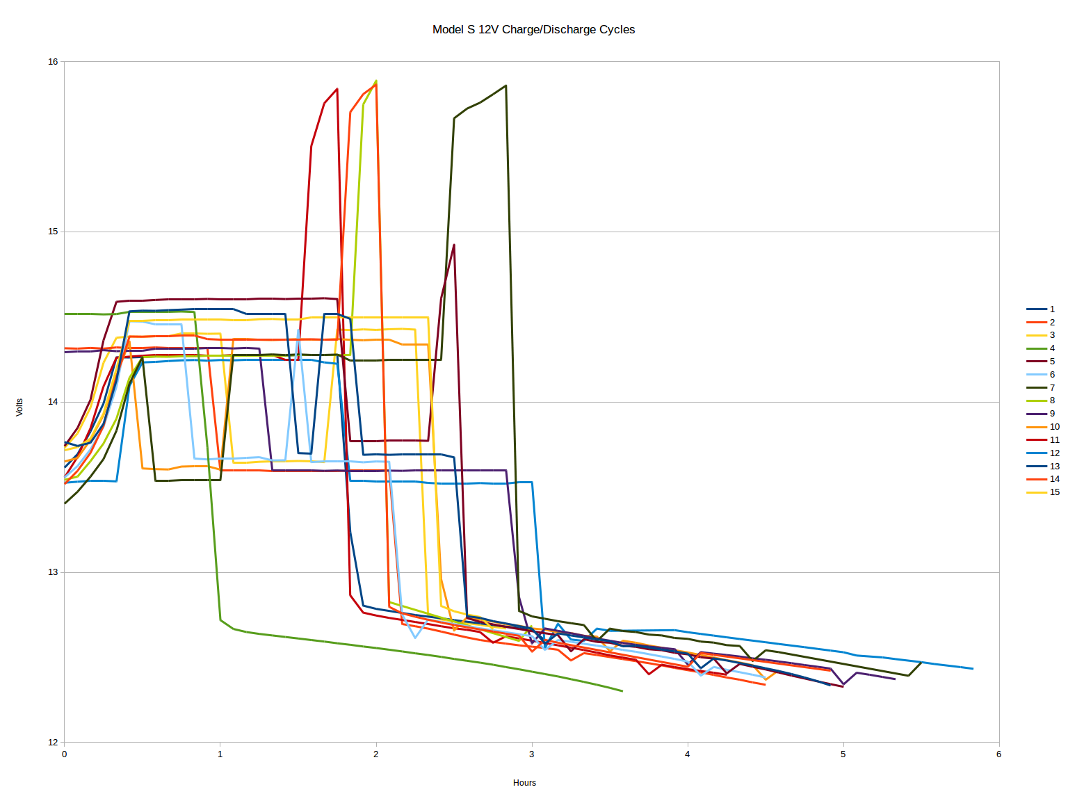I did two charts related to charge/discharge behavior, comparing all the cycles together. This first one starts at the beginning of a charge cycle and goes to the end of the discharge cycle. The second one is the same data, lined up at the start of the discharge part.
